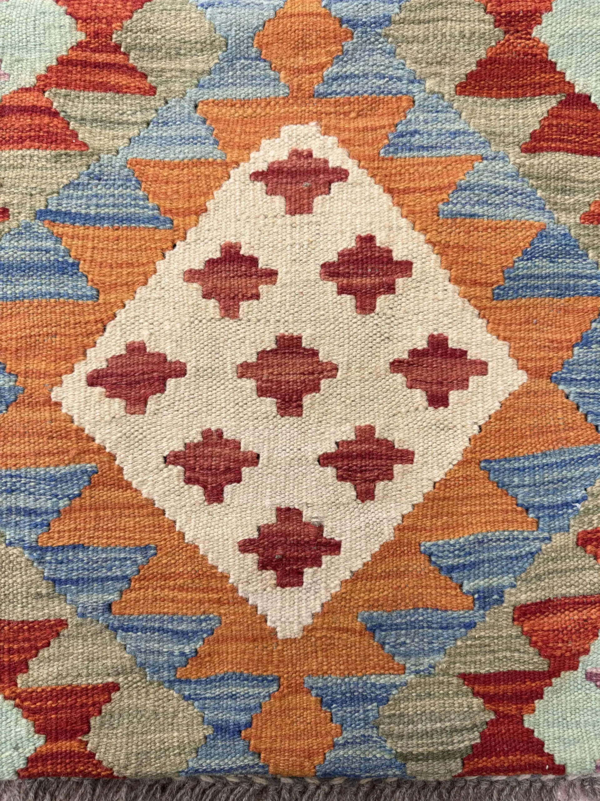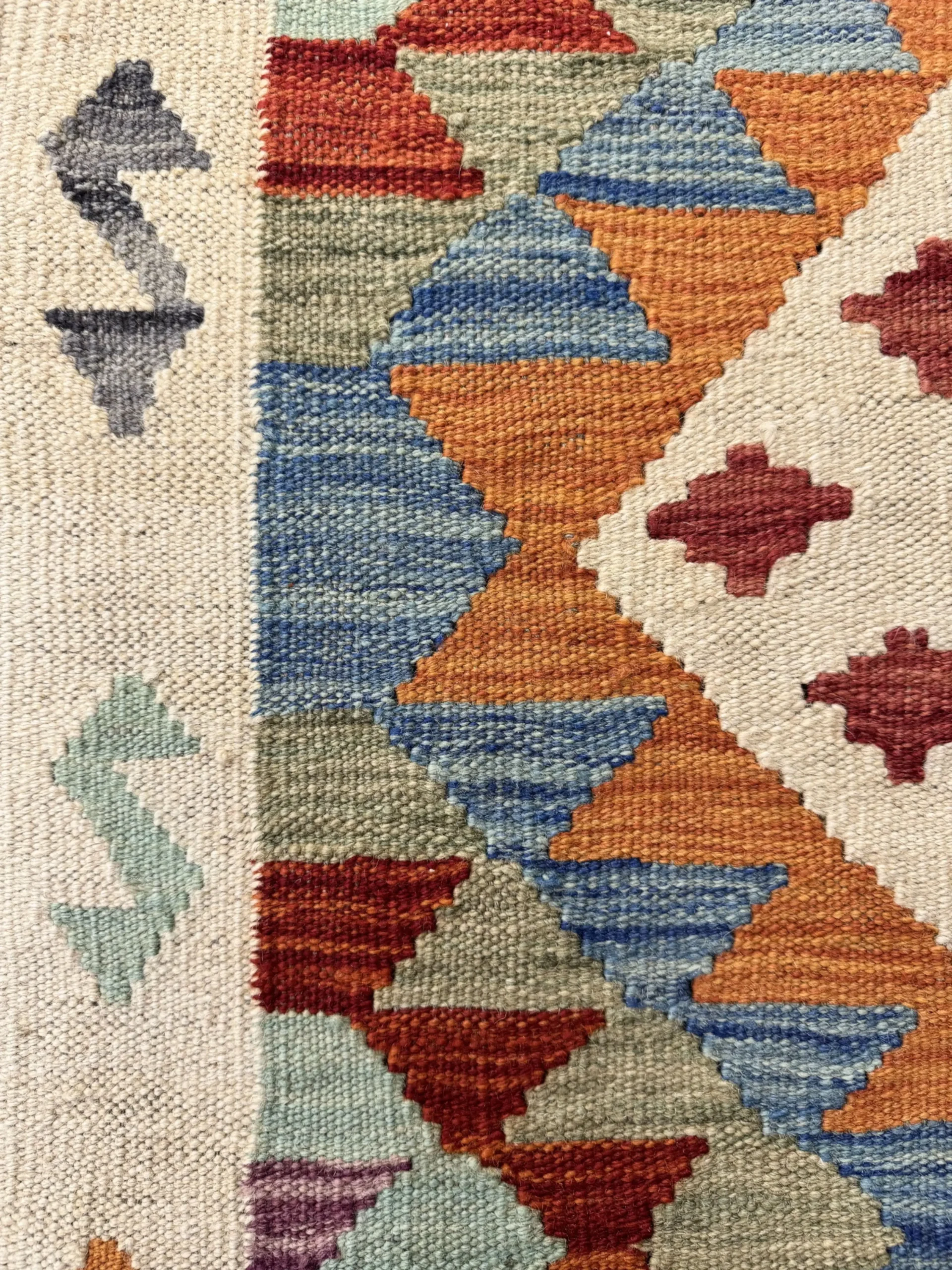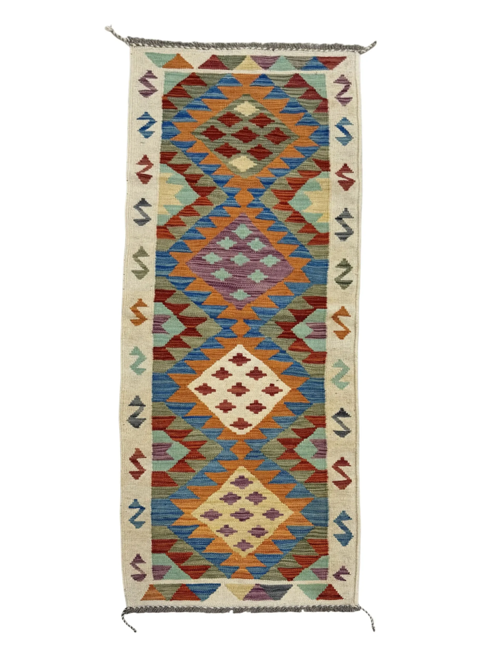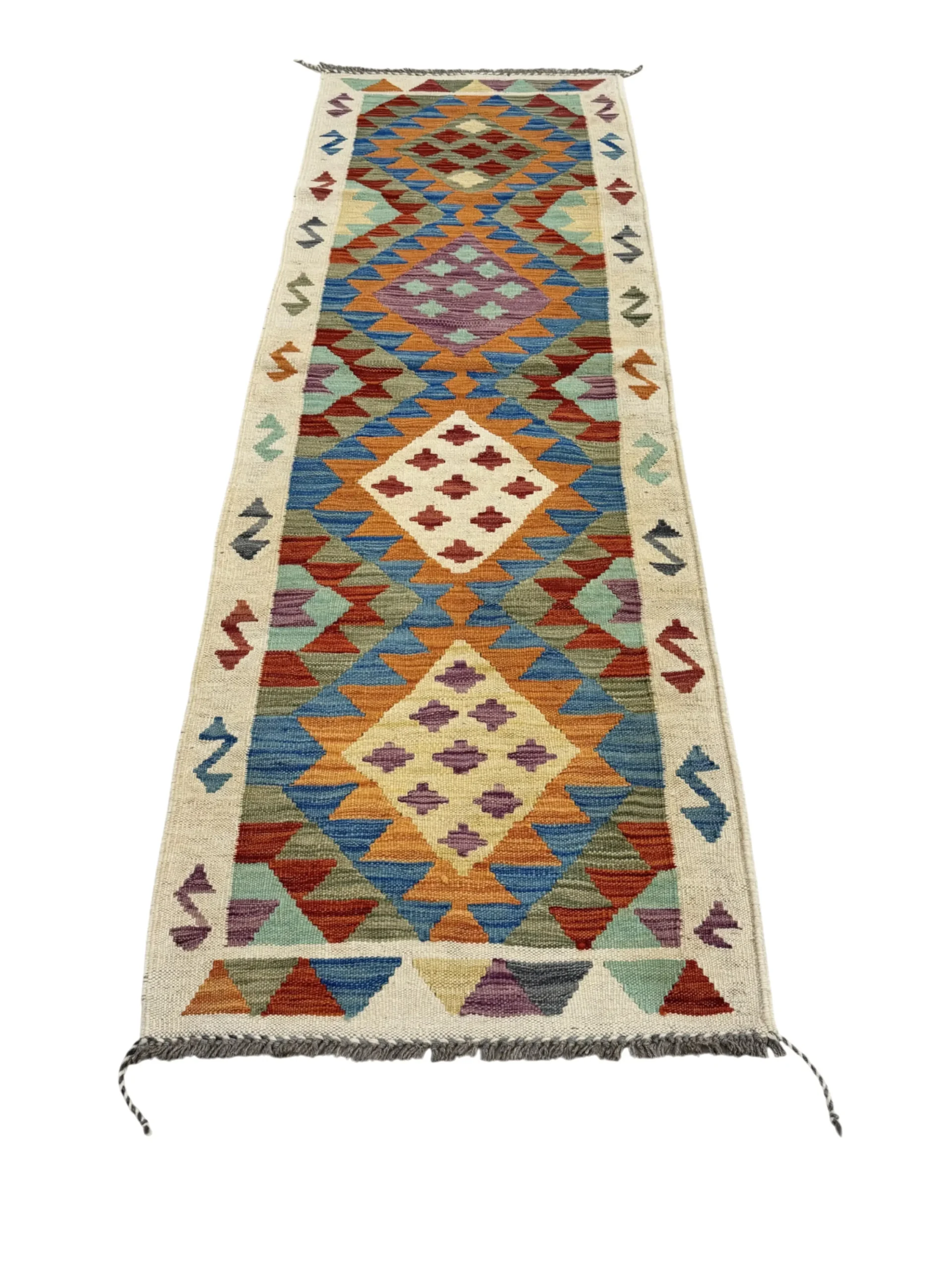 Realizzata con materiali resistenti e una trama ben definita, questa passatoia garantisce stabilità, comfort al passo e grande durabilità nel tempo. I bordi beige con motivi a “Z” aggiungono eleganza e completano l’estetica del tappeto, mentre i rombi e i dettagli geometrici centrali donano dinamismo all’intero design.
