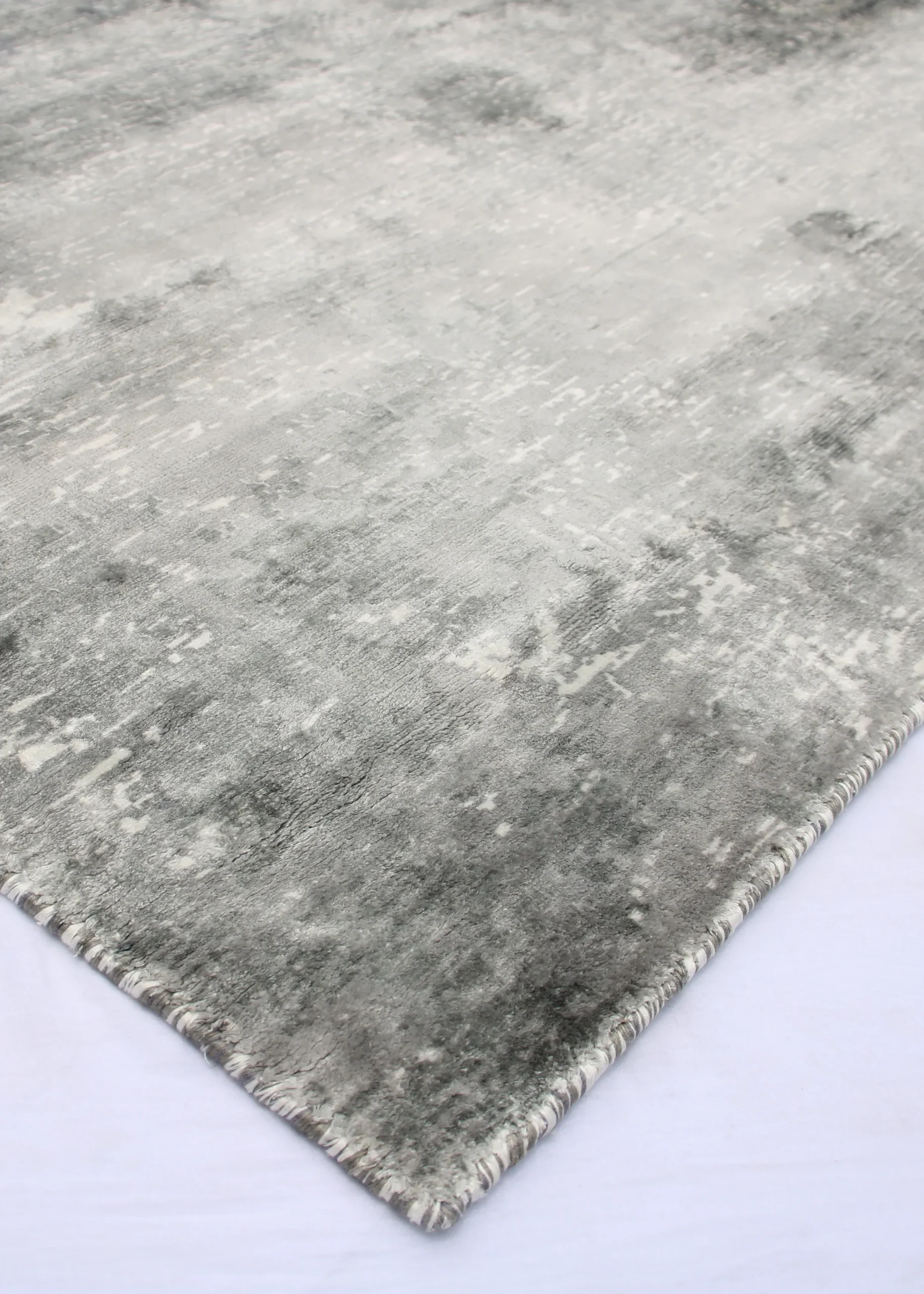 La superficie è caratterizzata da una texture irregolare e multisfaccettata, dove zone più chiare si mescolano a profondi contrasti di grigio creando un equilibrio visivo unico. L’effetto stratificato, con leggere linee orizzontali e sfumature diffuse, dona al tappeto un look sofisticato e minimalista, perfetto per chi desidera arricchire la propria casa con un elemento decorativo moderno e armonioso.