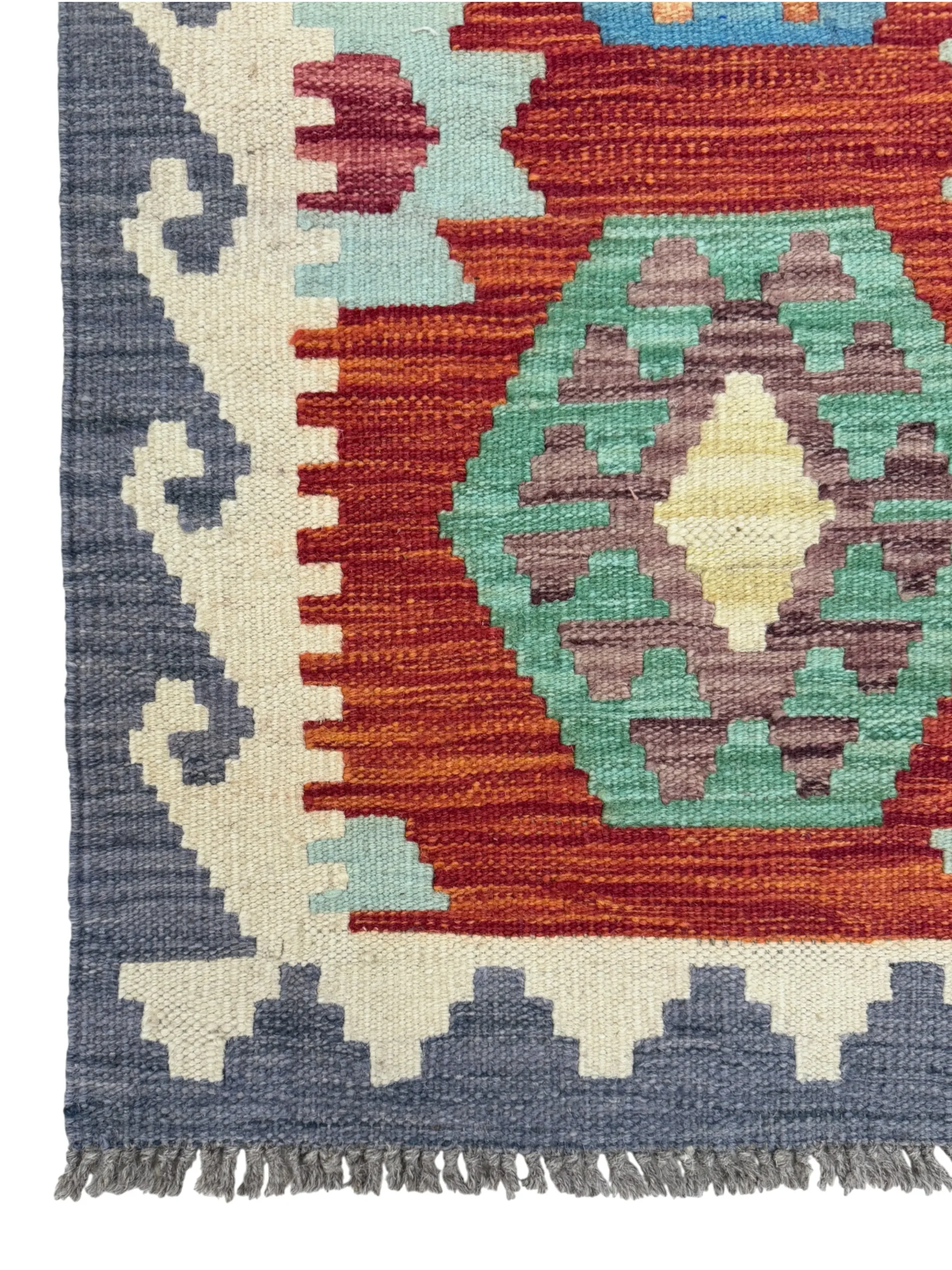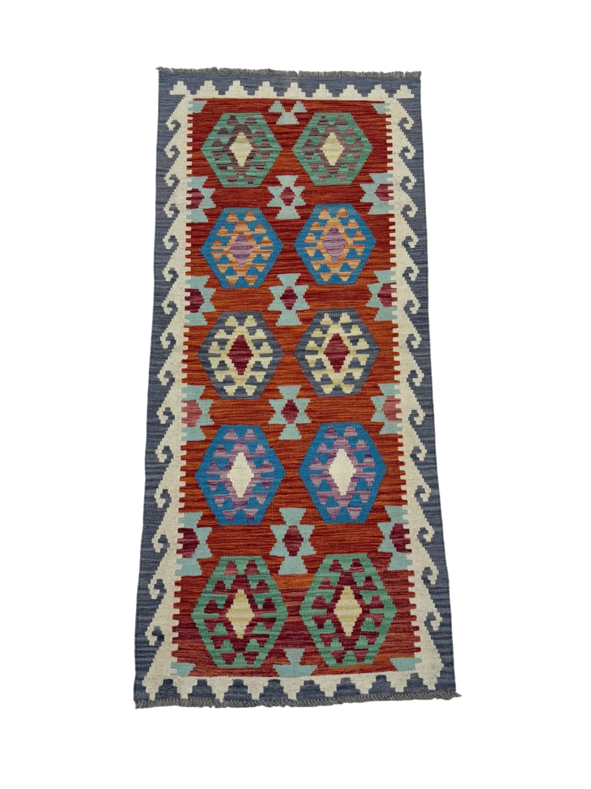 Il suo campo centrale arancione-rossastro ospita una sequenza di otto elementi esagonali multicolore nei toni del turchese, blu, rosso, giallo e bianco, ciascuno decorato con dettagli geometrici raffinati. Il bordo grigio-bluastro con motivo zig-zag bianco incornicia perfettamente il tappeto, mentre le frange grigie laterali aggiungono un tocco di autenticità artigianale.