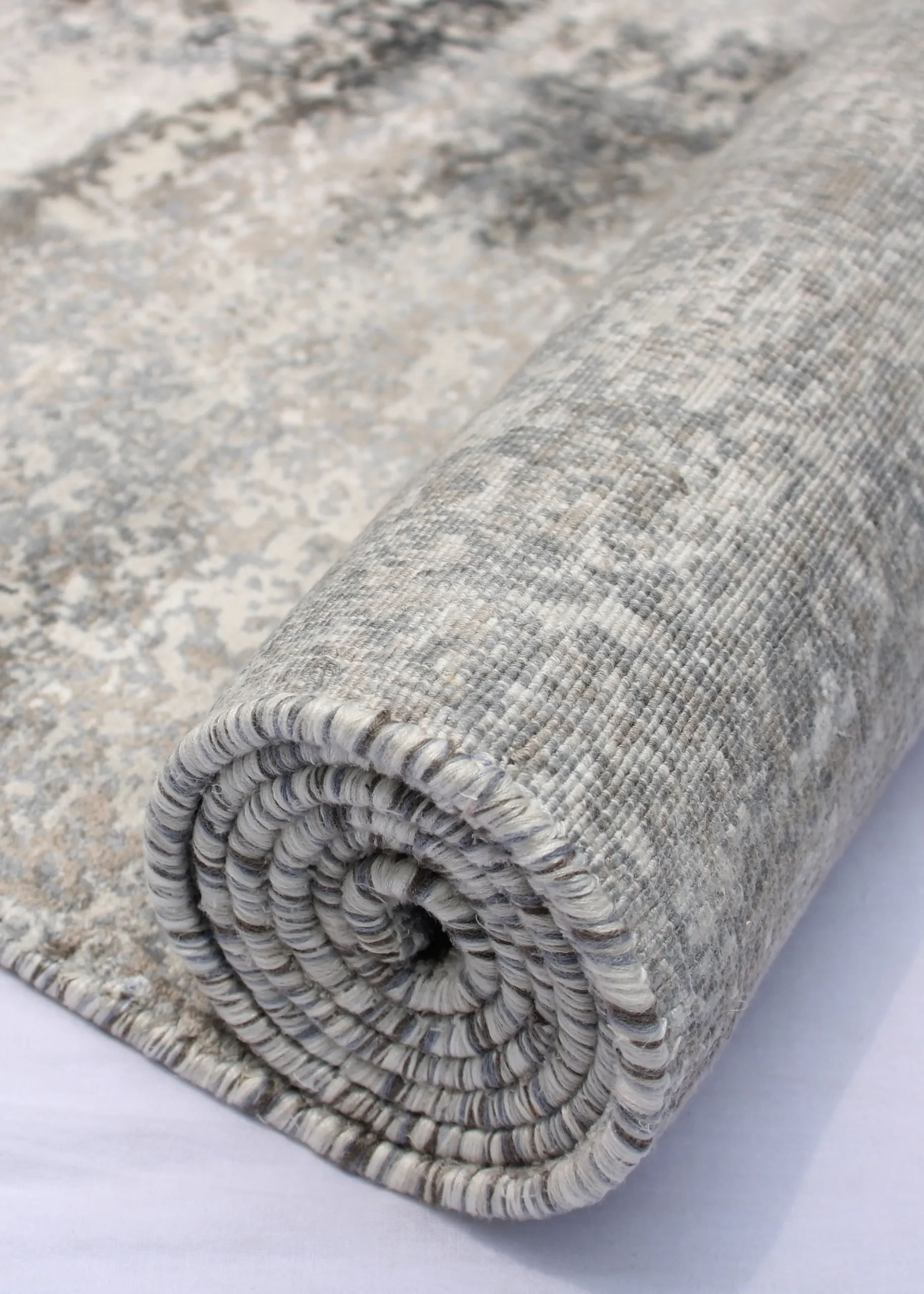 La superficie presenta una texture astratta e materica, caratterizzata da sfumature sofisticate di grigio, beige e bianco, ispirate all’effetto vissuto e leggermente invecchiato, molto ricercato nel design d’interni moderno. Le linee orizzontali irregolari attraversano il tappeto creando profondità visiva, movimento e un raffinato gioco di contrasti, ideale per valorizzare soggiorni, salotti, camere da letto e spazi open space.