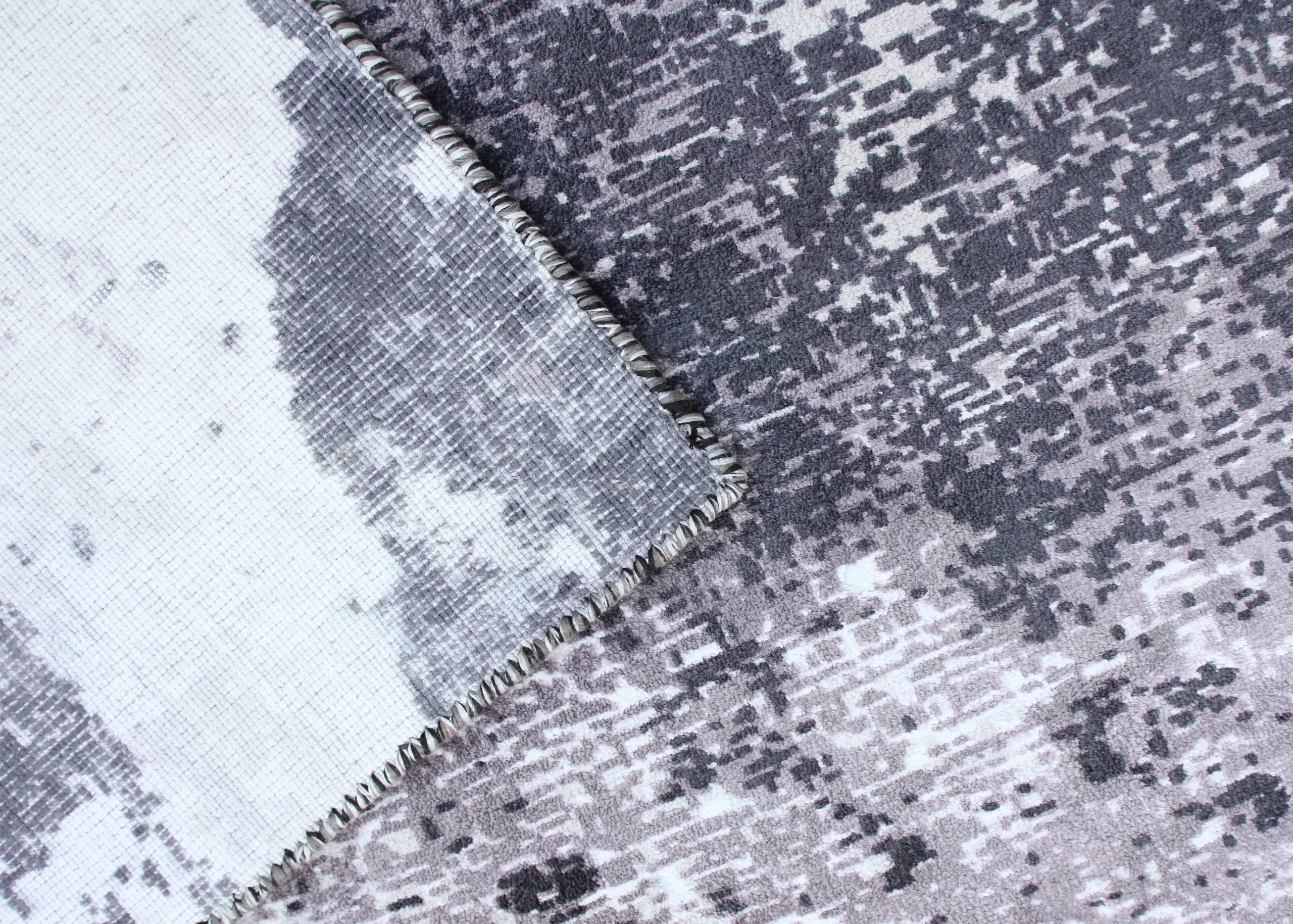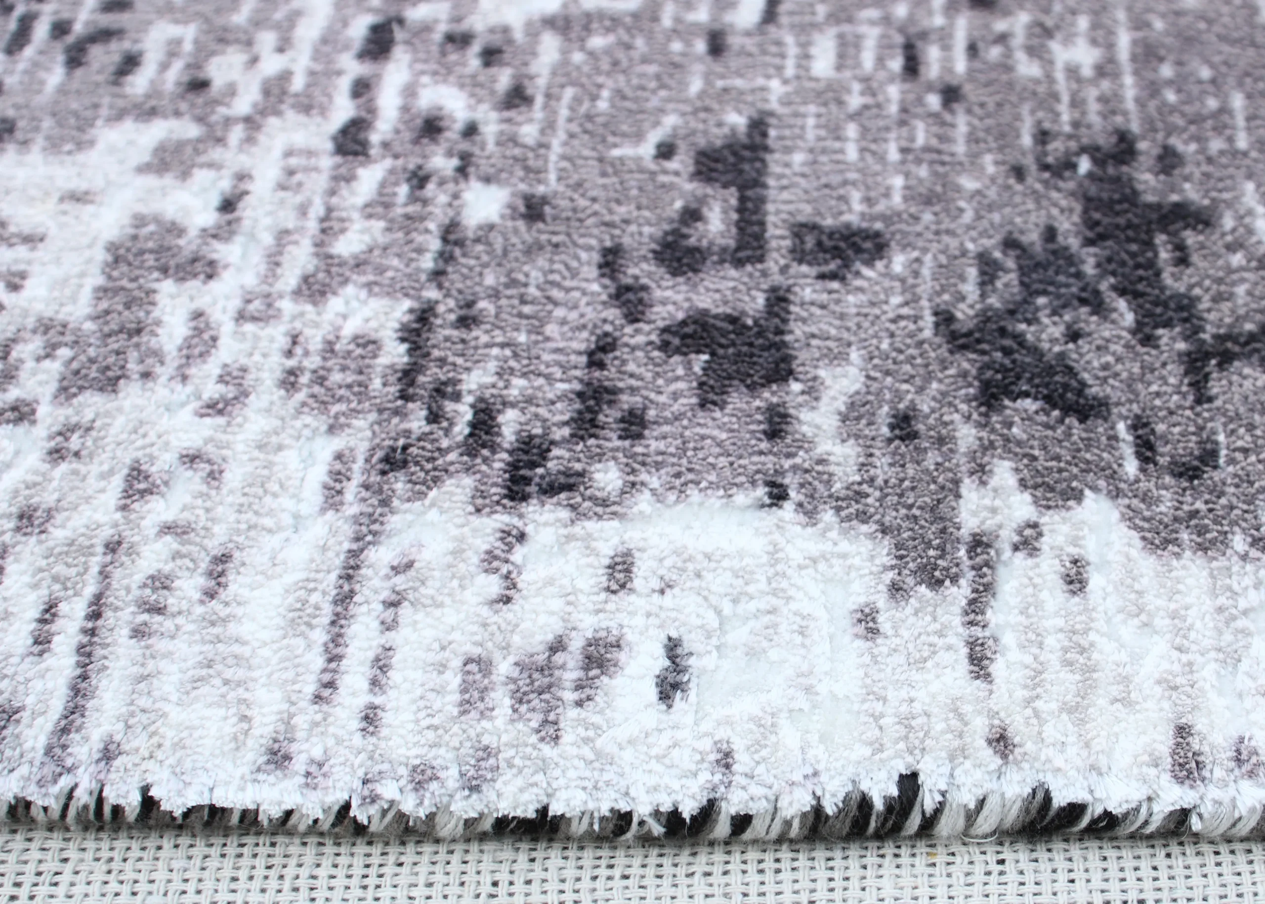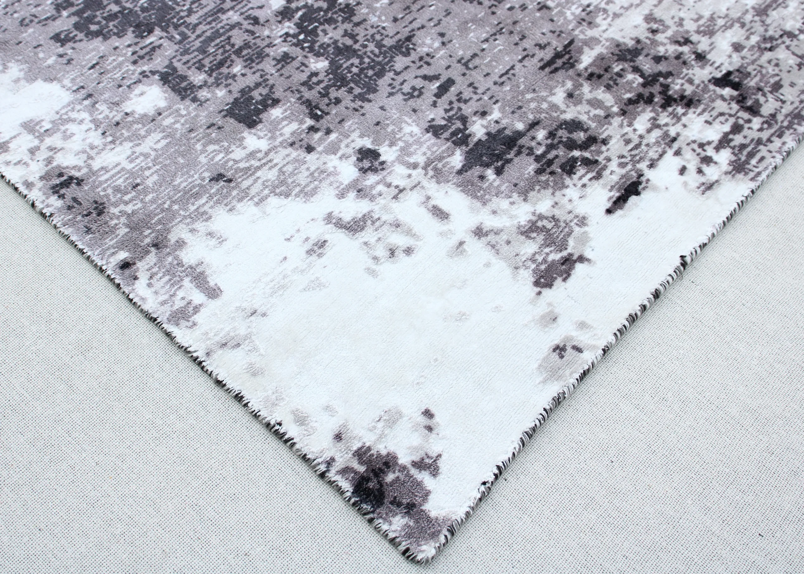 Il tappeto in tencel rettangolare si erge come un’opera d’arte moderna, posizionata con maestria al centro dell’ambiente. La trama astratta e irregolare cattura l’attenzione con le sue macchie e sfumature di colori neutri, tra cui grigi scuri, grigi chiari e accenni di bianco sporco. Questa composizione evoca un’immagine pittorica, con dettagli che suggeriscono una superficie vissuta e ricca di storia. Lo stile strutturato del design si fonde armoniosamente con la fluidità e dinamicità dei motivi, creando un gioco di luci e ombre che conferisce profondità all’ambiente circostante.