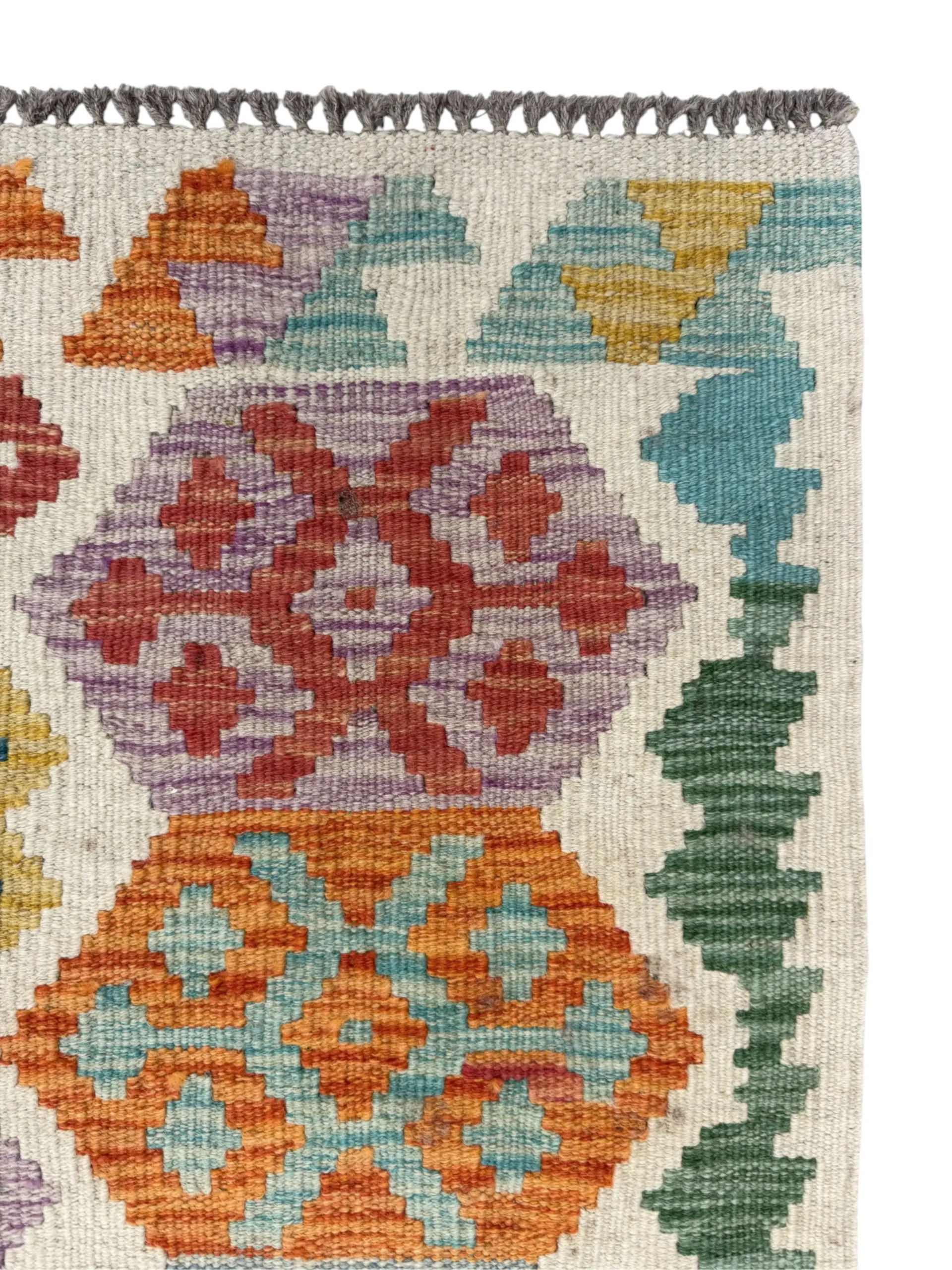 Scopri il fascino senza tempo del nostro tappeto kilim rettangolare 148×100 cm, un’opera d’arte tessile che unisce tradizione e modernità. Realizzato a mano con maestria, questo tappeto presenta un design geometrico complesso, caratterizzato da esagoni e rombi dai colori vivaci come arancione, giallo, rosso, viola, turchese, verde e beige. Ogni dettaglio riflette l’abilità artigianale e l’attenzione al particolare.