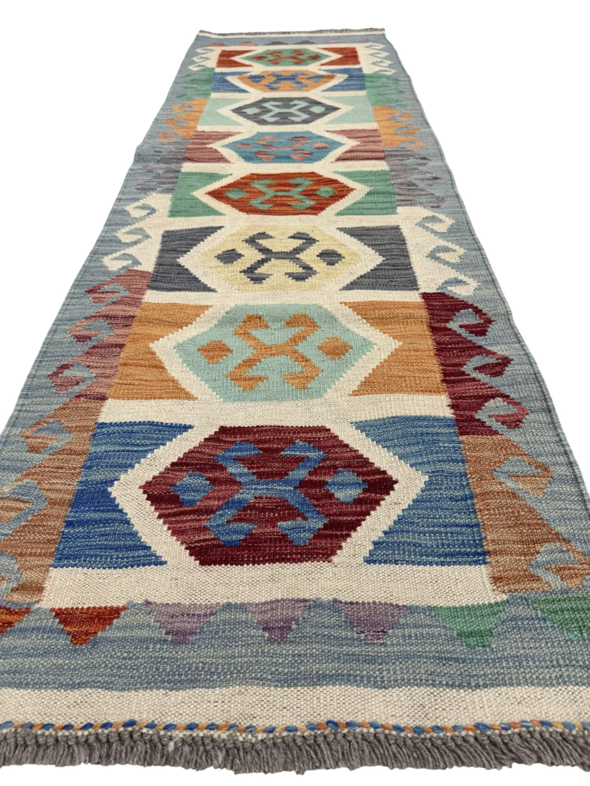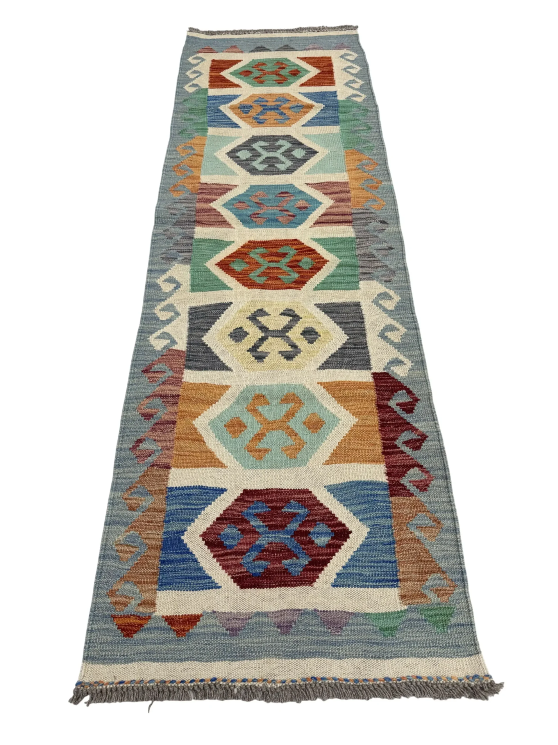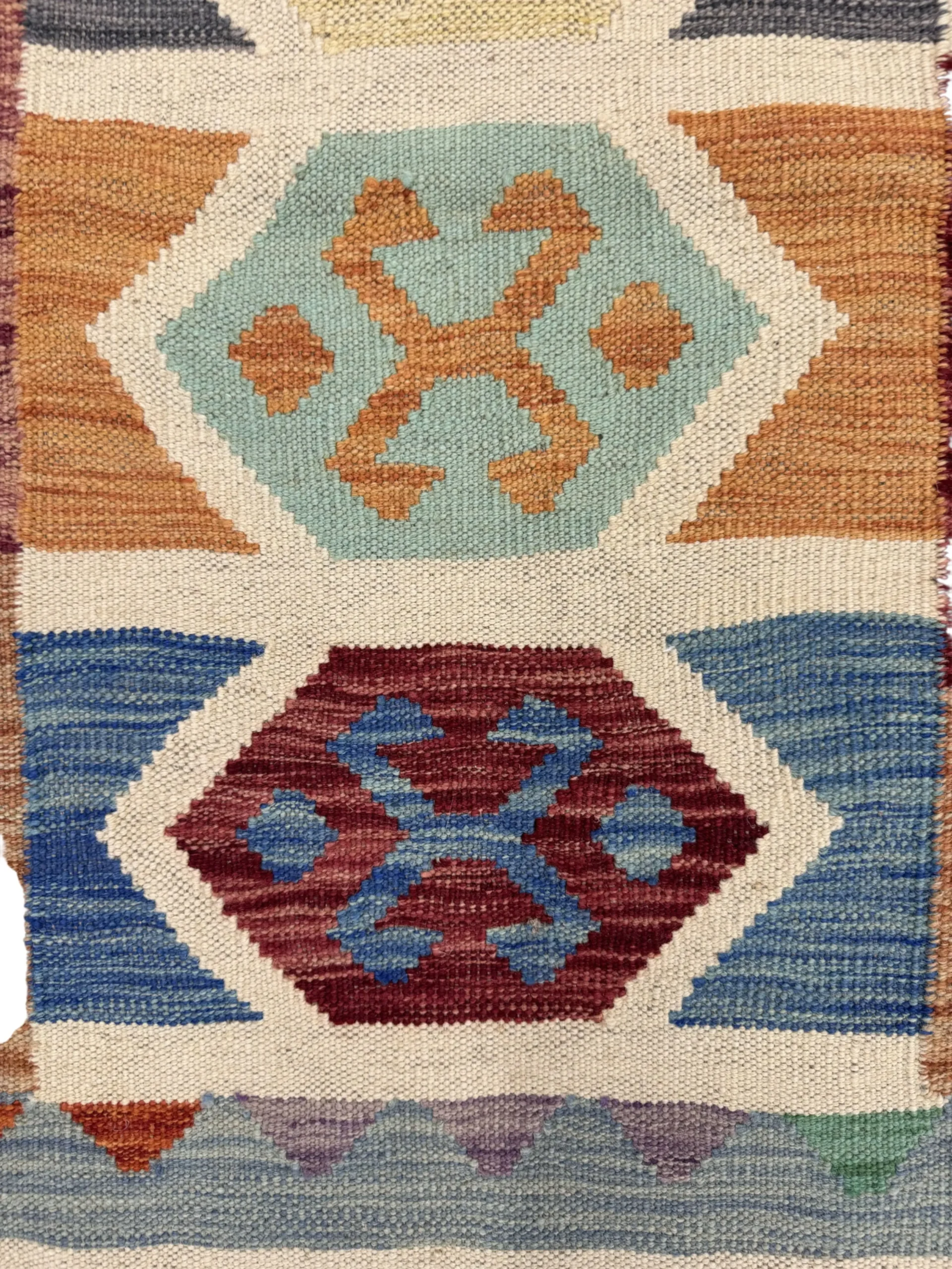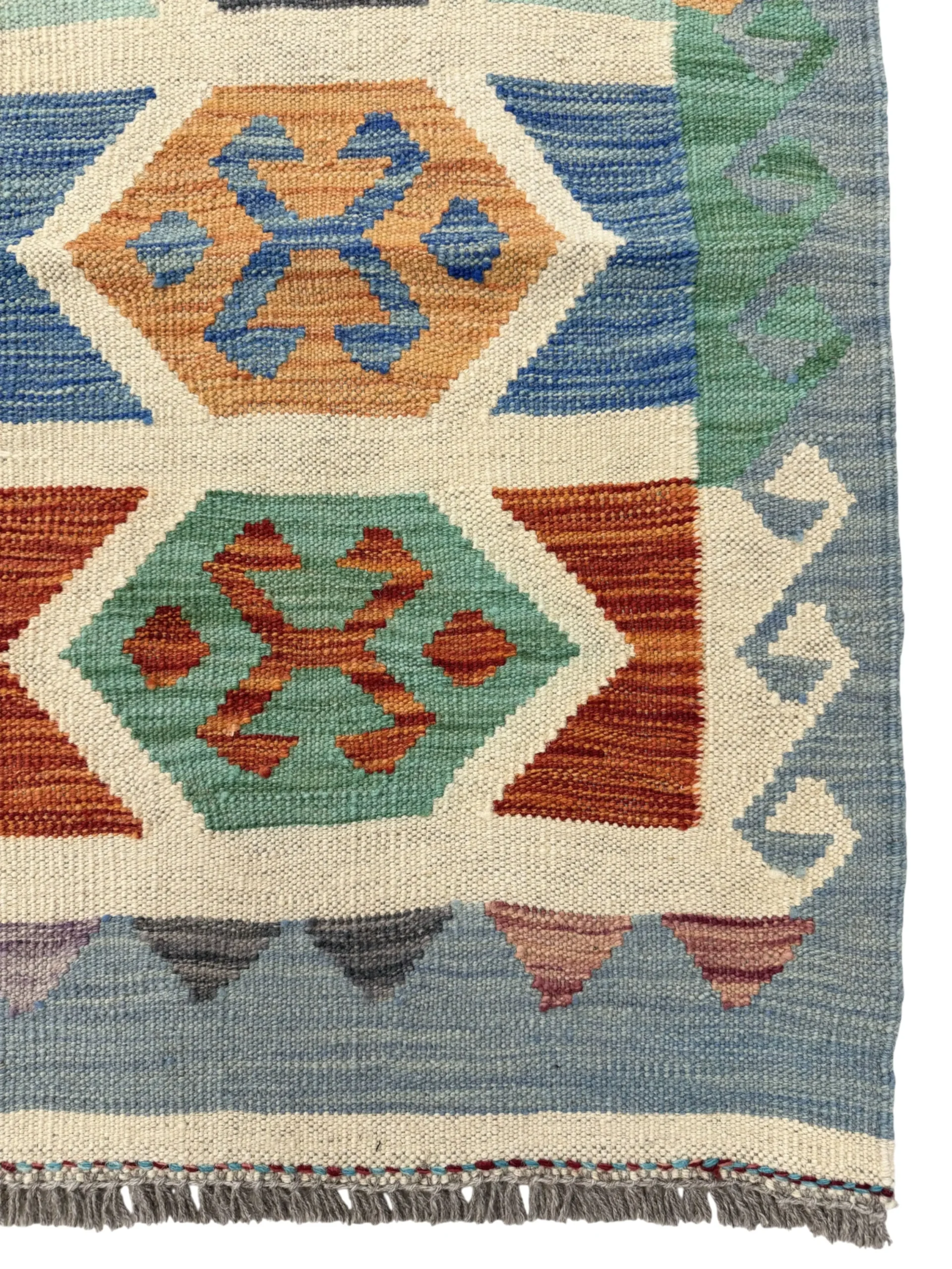 Il design presenta una composizione di losanghe simmetriche in tonalità vivaci come rosso, verde, blu, arancione, giallo e turchese, combinate con sfumature neutre che ne facilitano l’abbinamento con qualsiasi stile di arredo. Il bordo blu-grigio decorato con motivi a zig-zag aggiunge un tocco distintivo, mentre la frangia grezza superiore richiama la tradizione dei tappeti tessuti a mano.