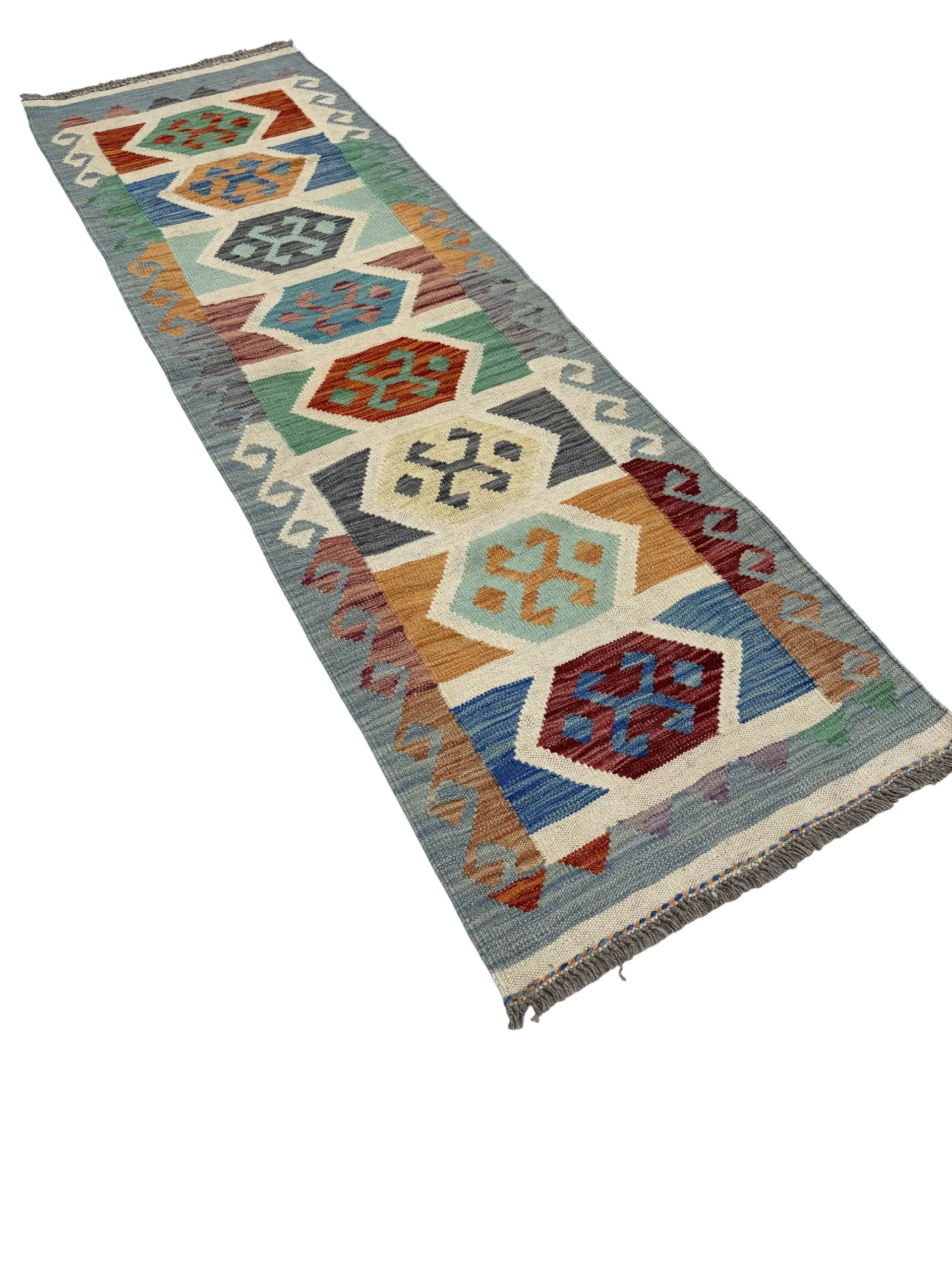 Aggiungi stile e colore al tuo spazio con questo tappeto Kilim geometrico multicolore 201×62 cm, realizzato con lavorazione artigianale e decorato con losanghe simmetriche dai toni vivaci. Perfetto per corridoi, ingressi e zone di passaggio, offre una trama resistente, facile da pulire e ideale per valorizzare ambienti moderni, boho e classici rivisitati.