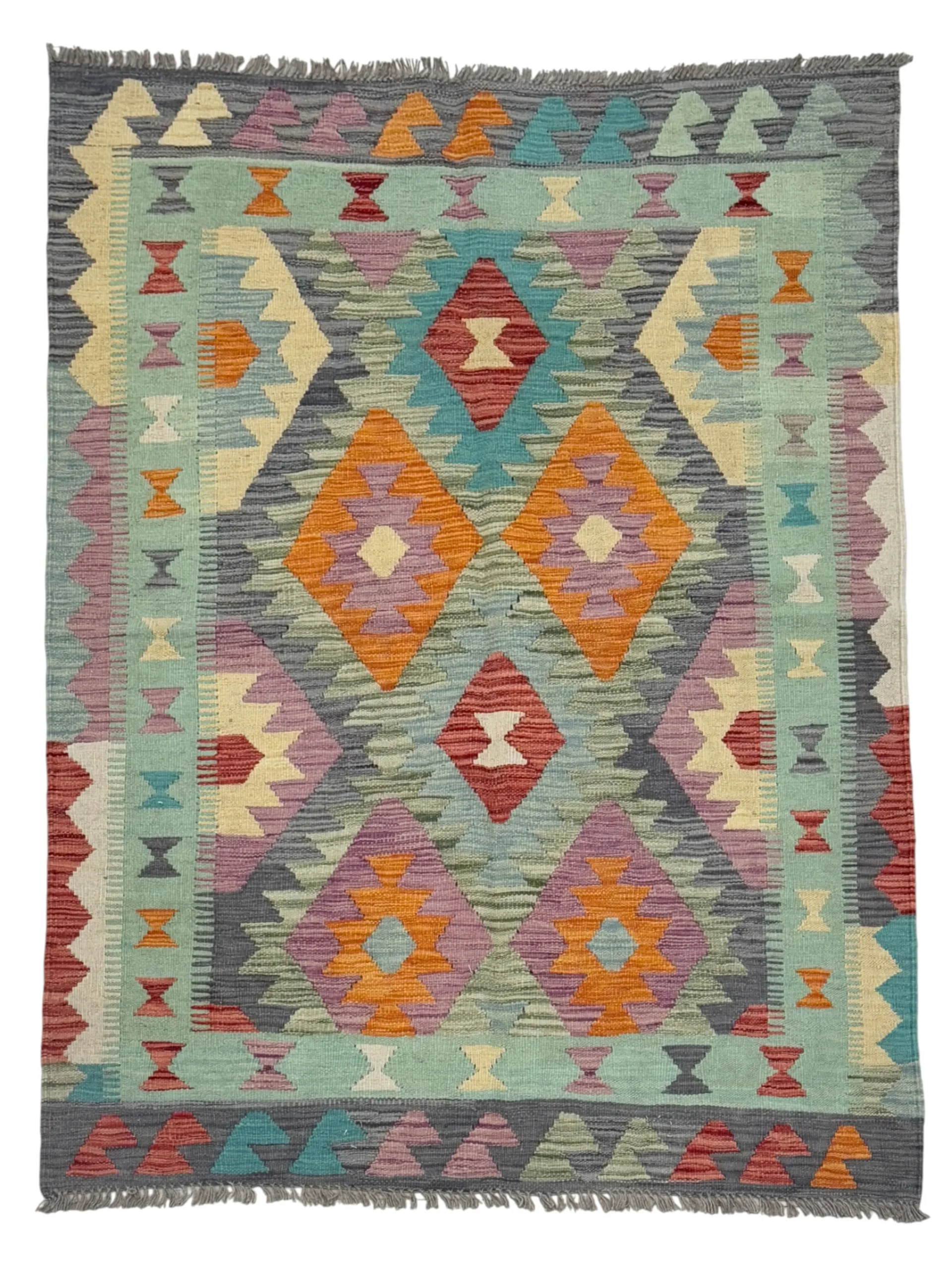 Scopri il fascino autentico del Tappeto Kilim Quadrato 173×122 cm, un capolavoro di artigianato che unisce tradizione e stile contemporaneo. Realizzato a mano con lana naturale di alta qualità, questo tappeto presenta un disegno geometrico intricato con rombi e losanghe che si intrecciano armoniosamente, creando un equilibrio perfetto tra colori vivaci e tonalità neutre come verde menta, arancione, rosa, beige, grigio antracite e turchese.