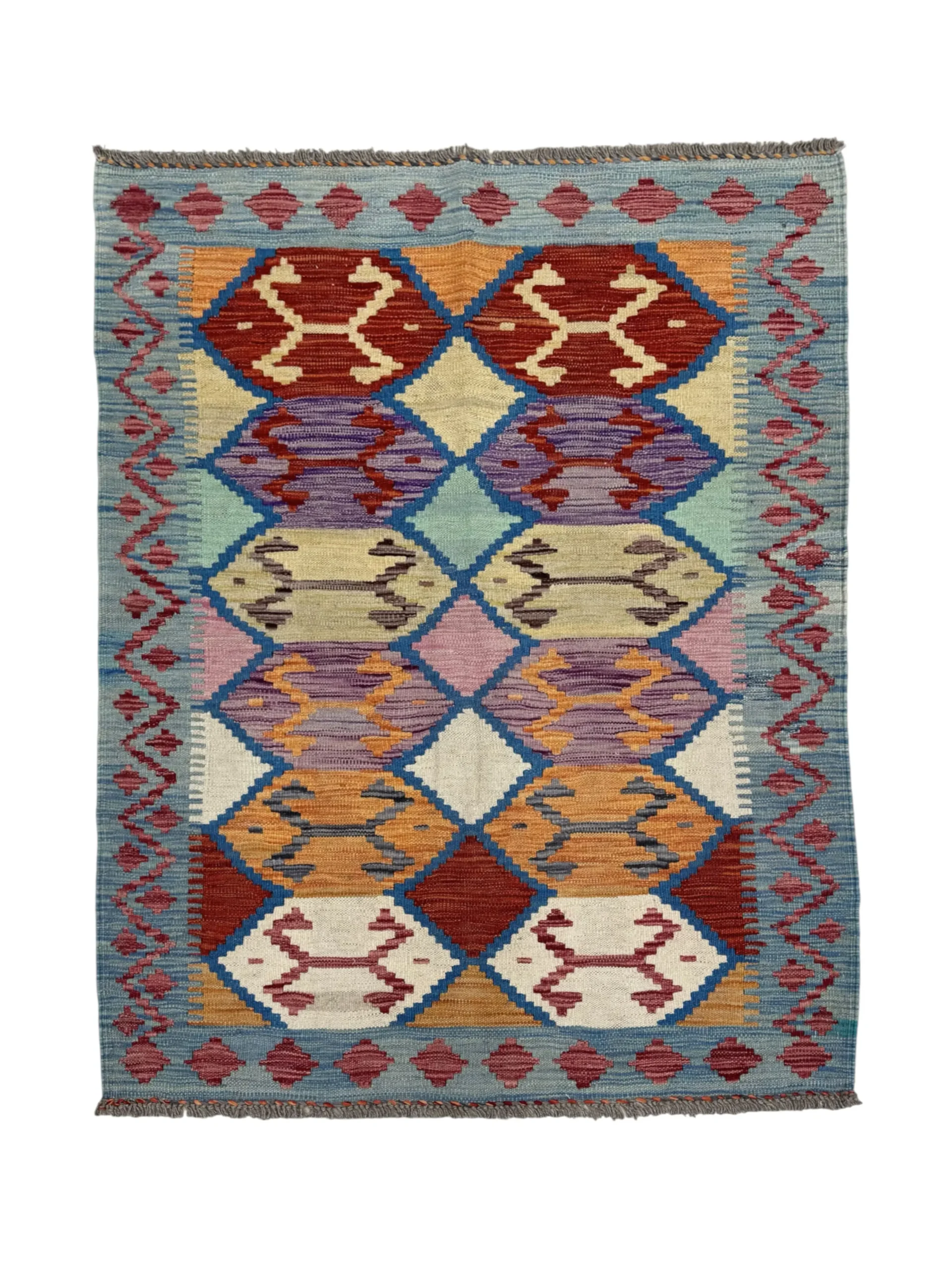 Elegante tappeto Kilim rettangolare in lana 146×102 cm, realizzato a mano con motivi geometrici colorati. Perfetto per arredare salotto, soggiorno o camera da letto con un tocco autentico e artigianale, combina tradizione orientale e design moderno per un ambiente caldo e accogliente.
