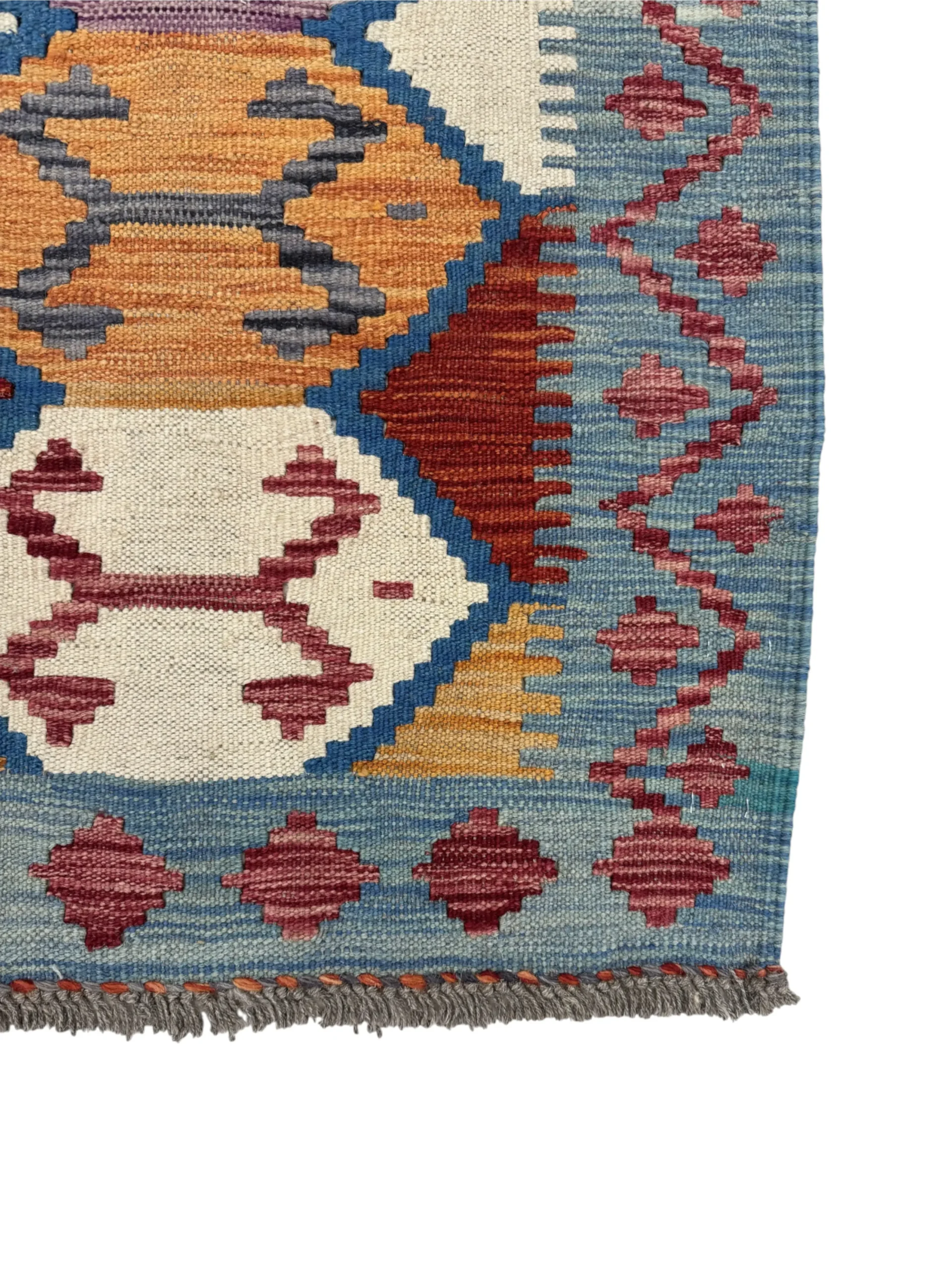 Il disegno presenta una cornice blu pallido arricchita da diamanti rossi e dettagli zigzag, mentre la parte centrale si distingue per un gioco armonico di forme a diamante e rettangoli multicolori. Le tonalità vivaci di rosso ruggine, arancione, giallo crema, turchese, viola e blu creano un effetto visivo dinamico, perfetto per dare personalità e carattere a qualsiasi ambiente.
