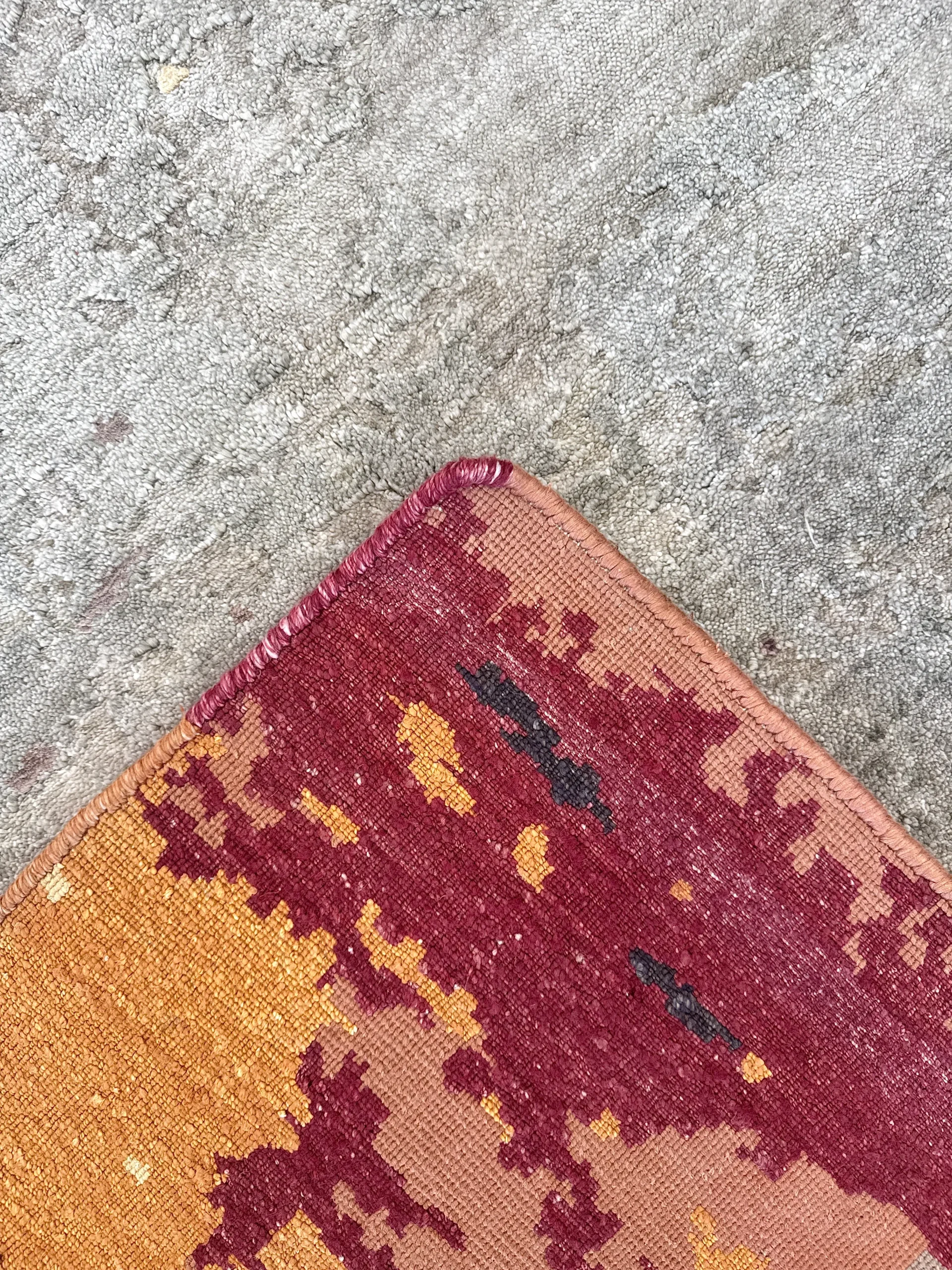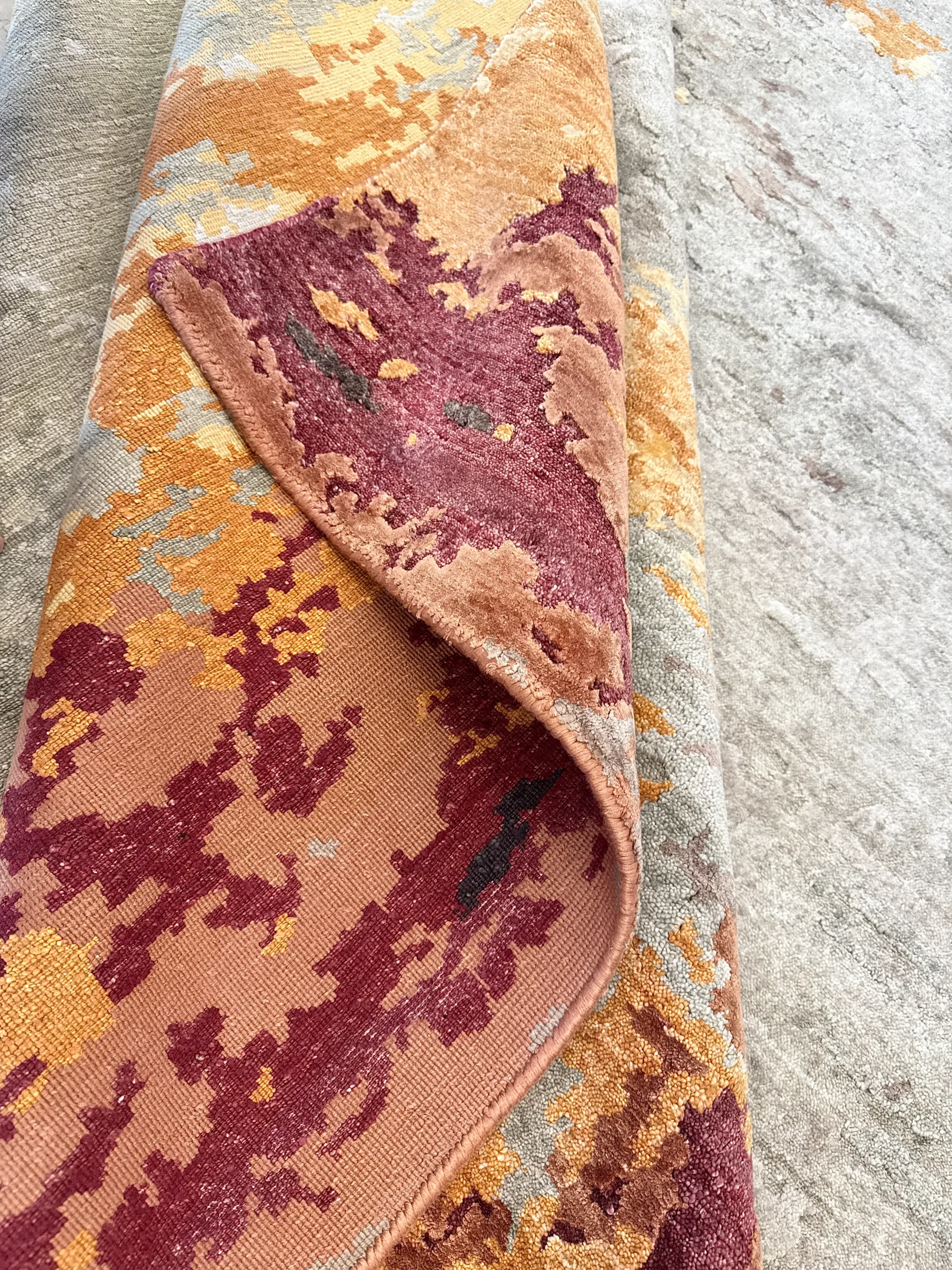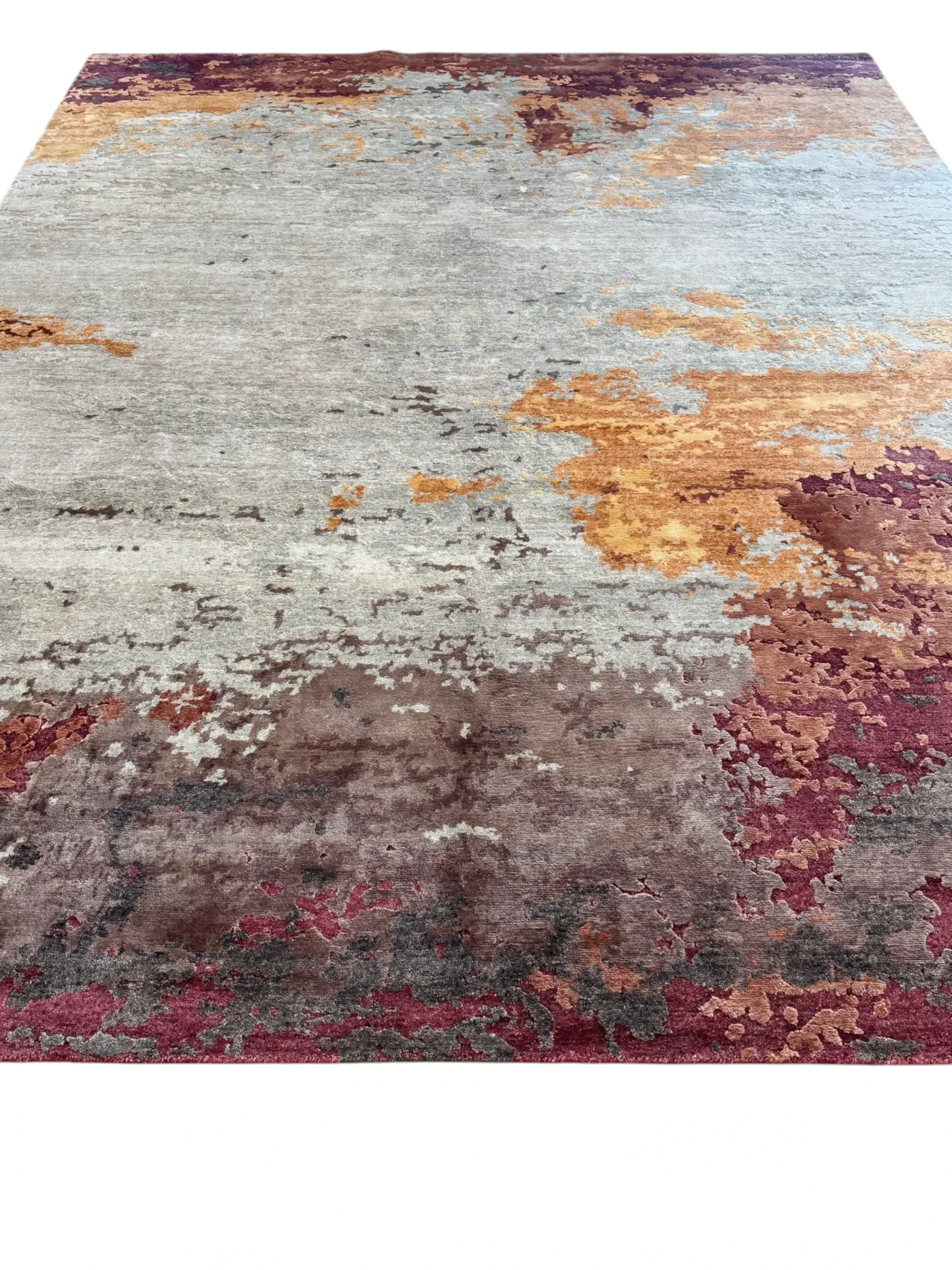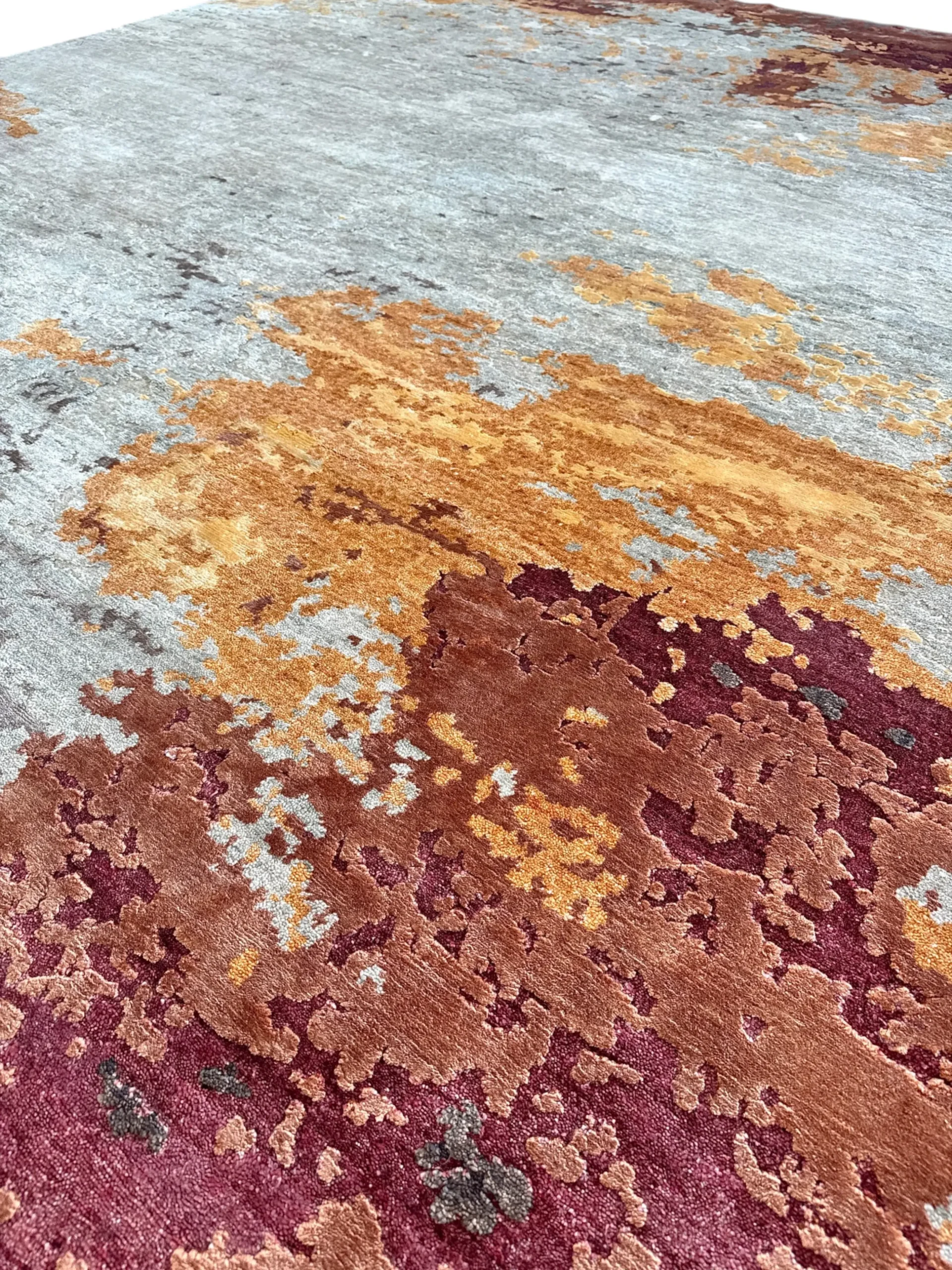 Tappeto moderno astratto 300×252 cm in bambù e seta, pensato per valorizzare soggiorni spaziosi, salotti eleganti e ambienti contemporanei con una presenza scenica raffinata. Il disegno astratto, ispirato a superfici naturali e texture pittoriche, unisce tonalità di grigio chiaro, bordeaux, ruggine e arancione bruciato in una composizione sofisticata che dona profondità, calore e movimento visivo.