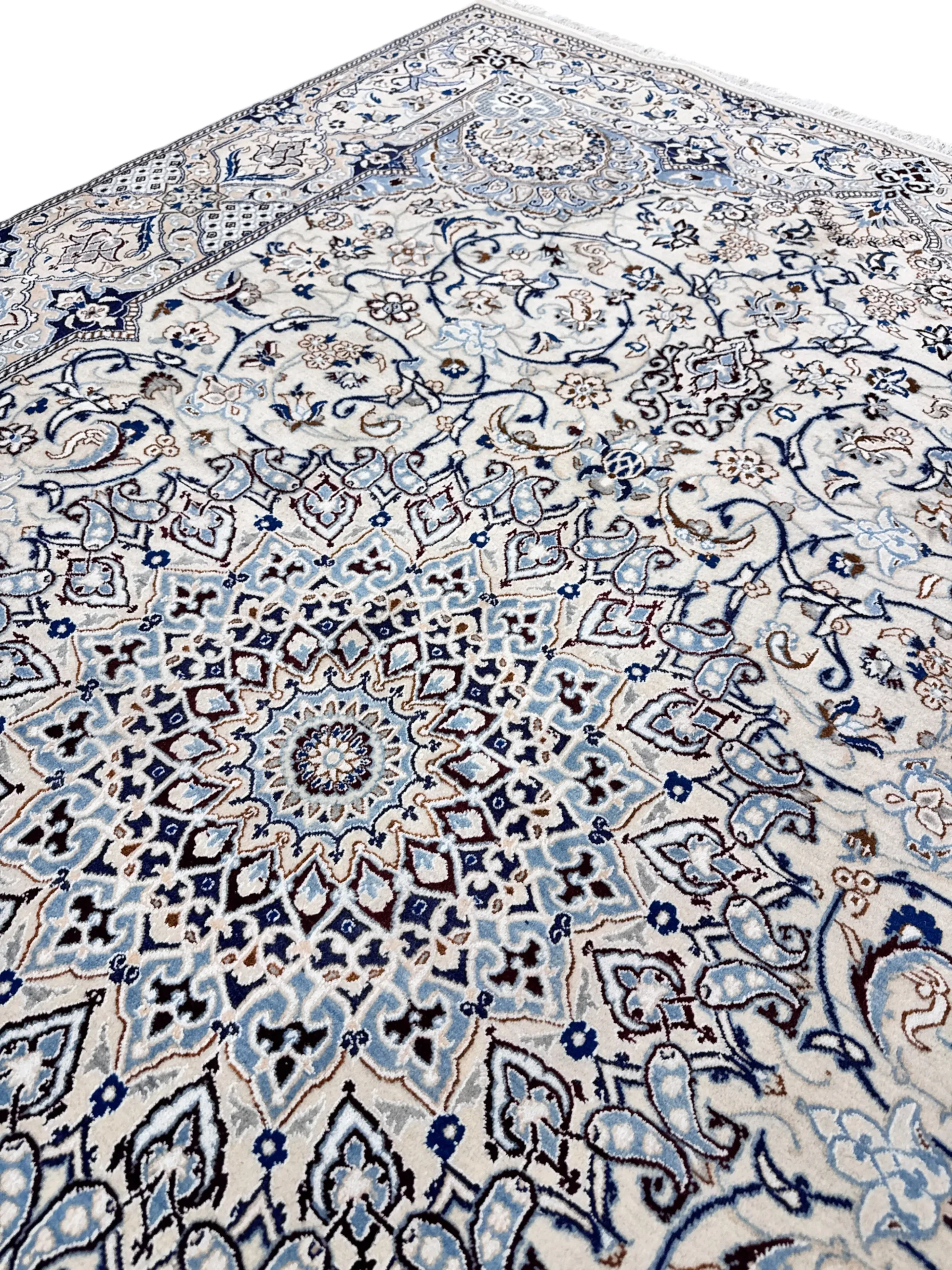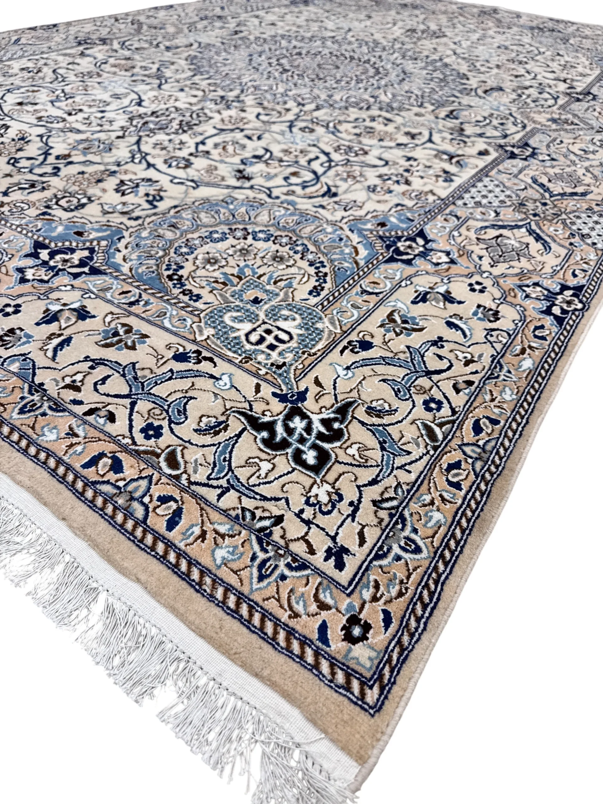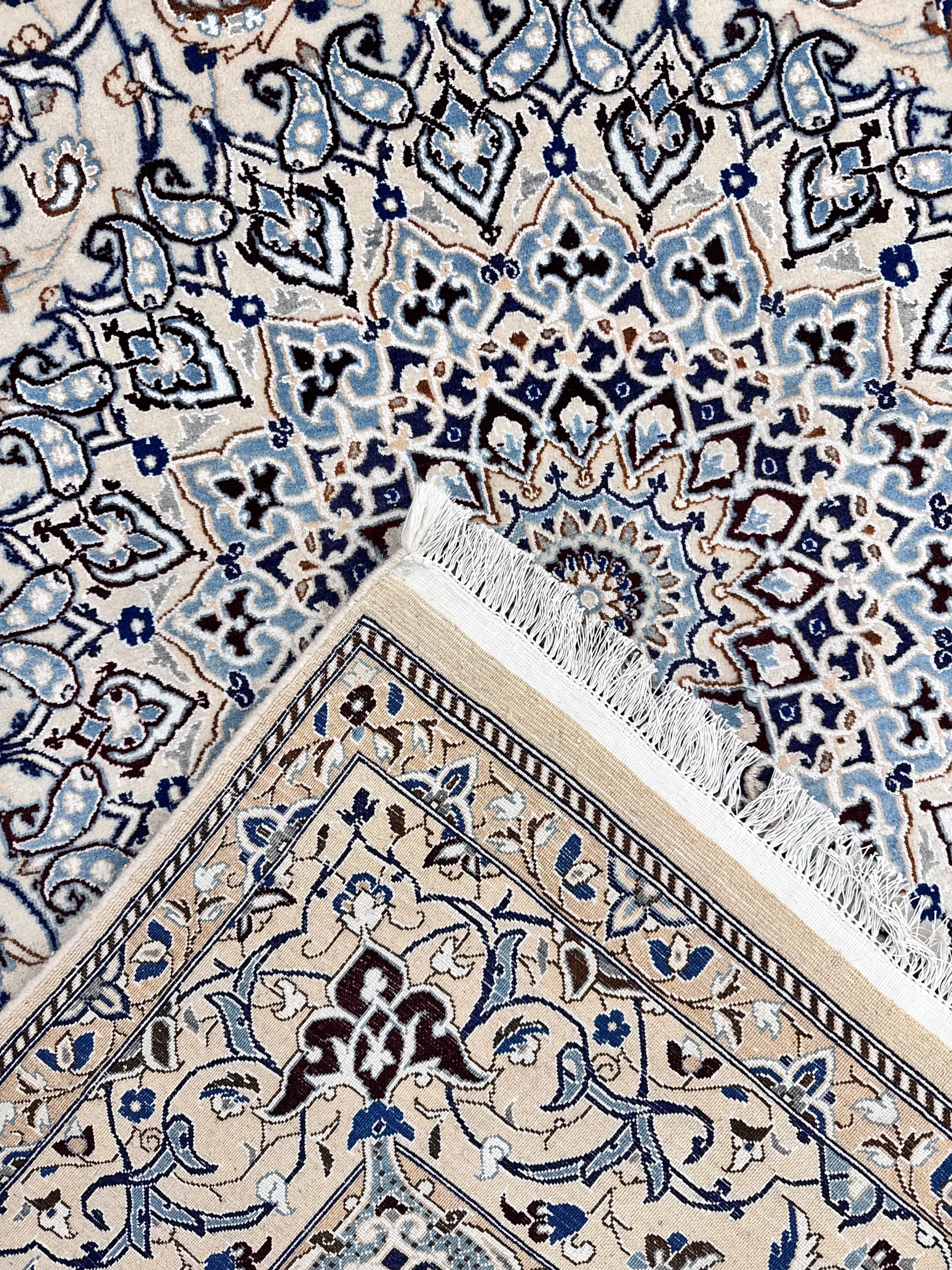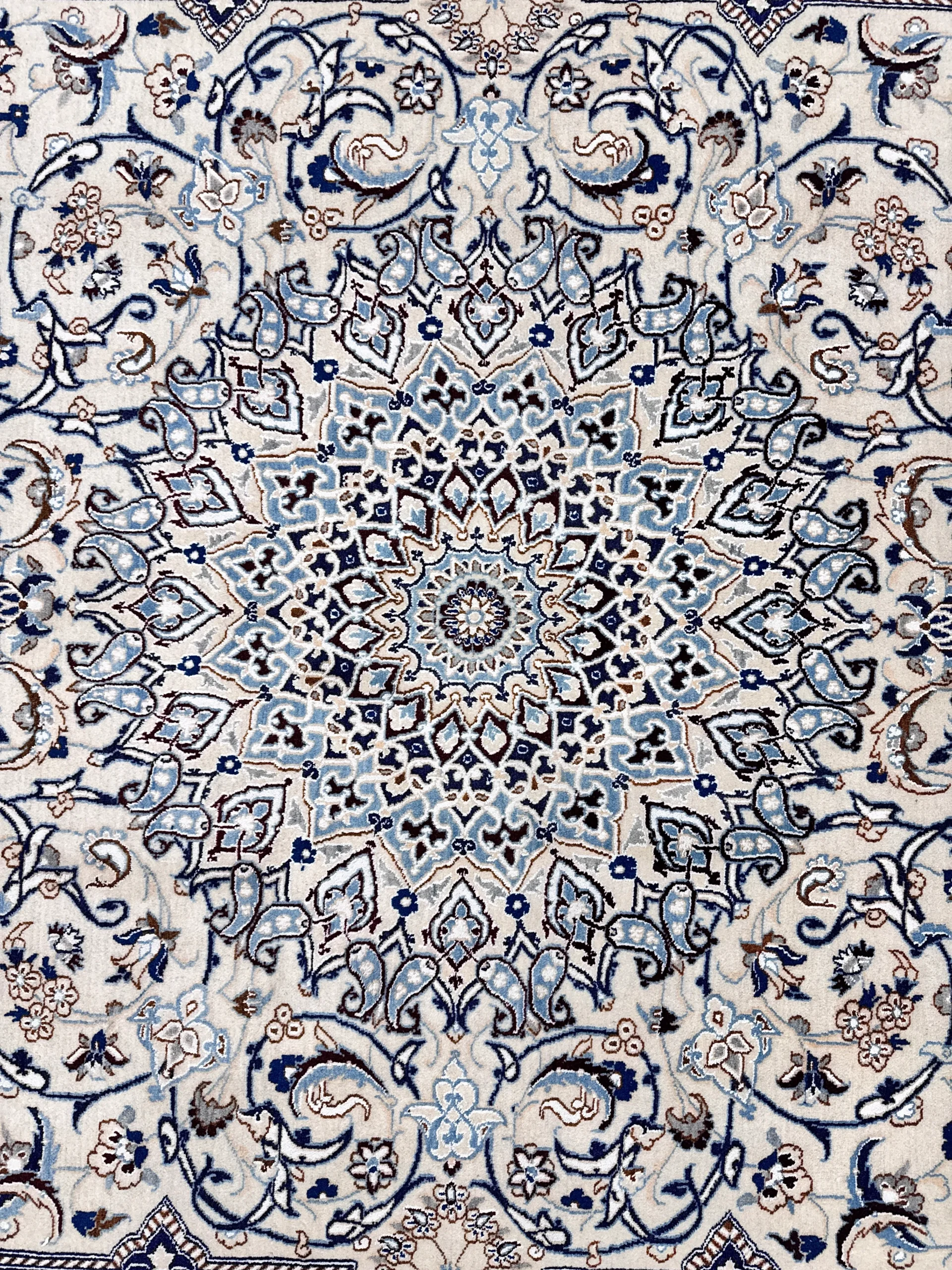 Materiali pregiati: Realizzato in lana e seta, il tappeto Nain 9 fili presenta una trama fine e resistente, garantendo una lunga durata nel tempo senza compromettere la morbidezza al tatto.