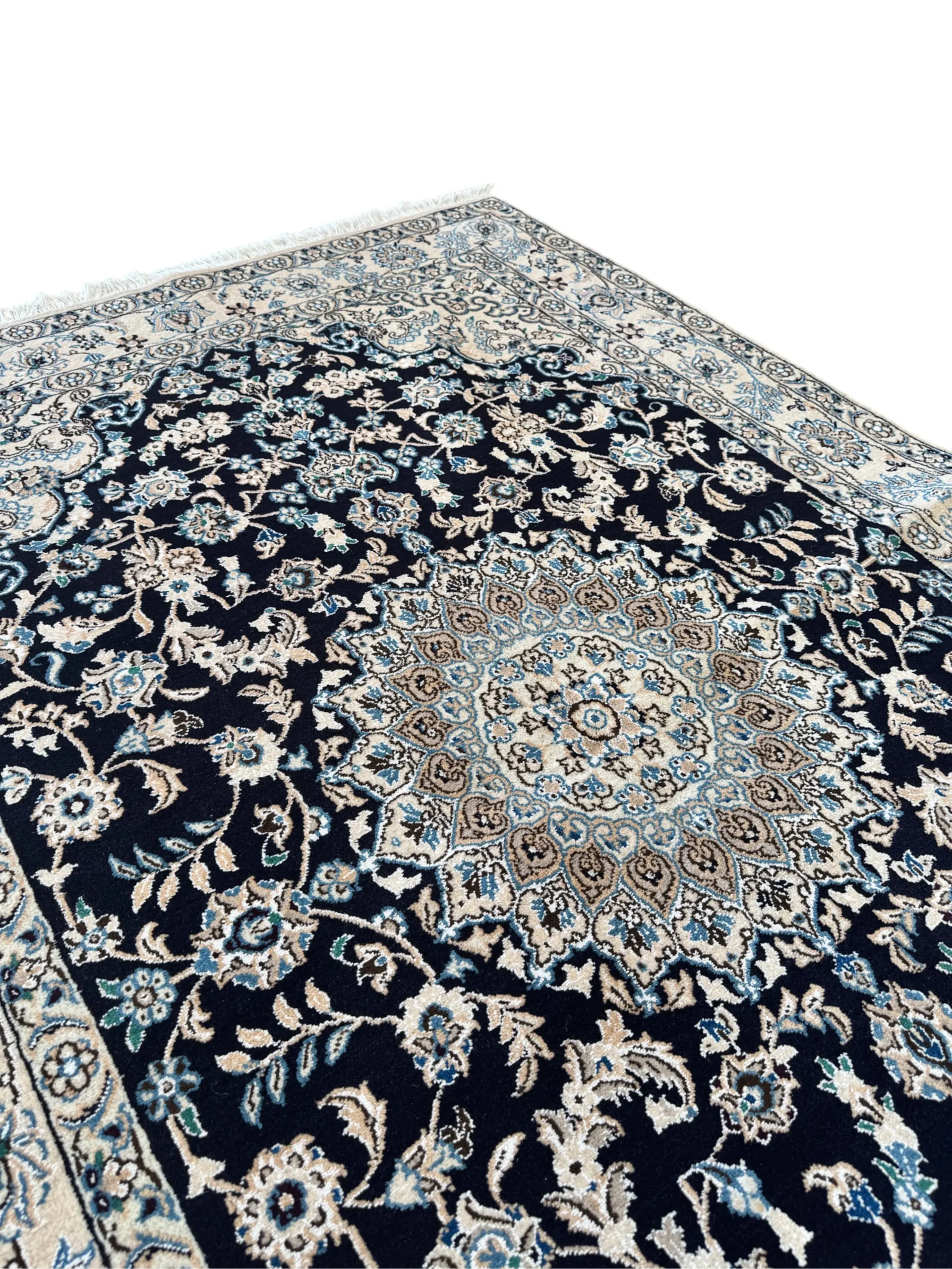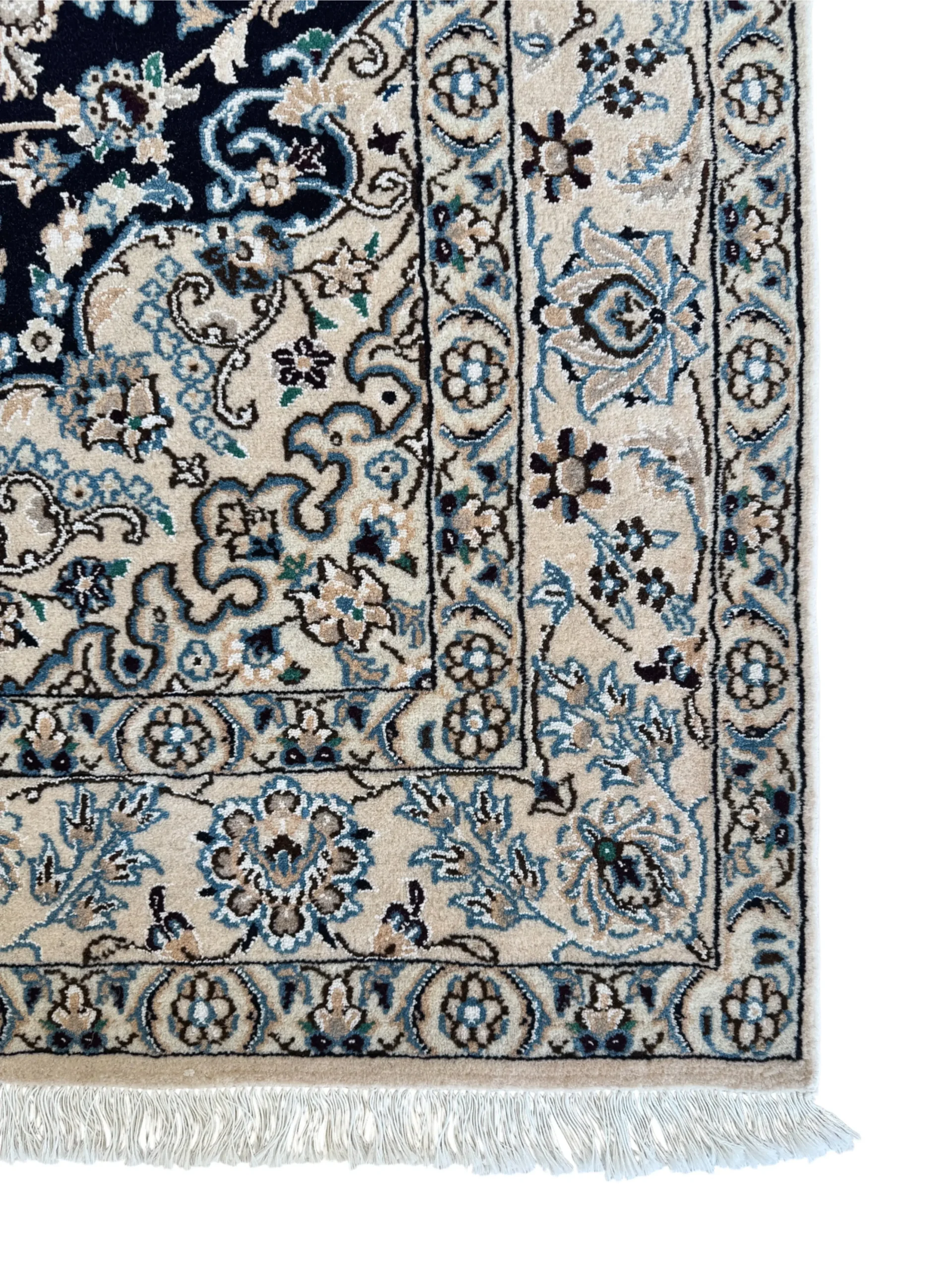 Tappeto Nain 9 Fili Persiano 203×133 cm – autentico capolavoro annodato a mano in lana di alta qualità. Di forma rettangolare, con un’elegante combinazione di colori crema, blu e nero, questo tappeto orientale offre uno stile raffinato e senza tempo. Perfetto per arredare salotto, camera da letto, cameretta o ufficio, unisce tradizione artigianale persiana e valore estetico. Certificato di autenticità incluso.