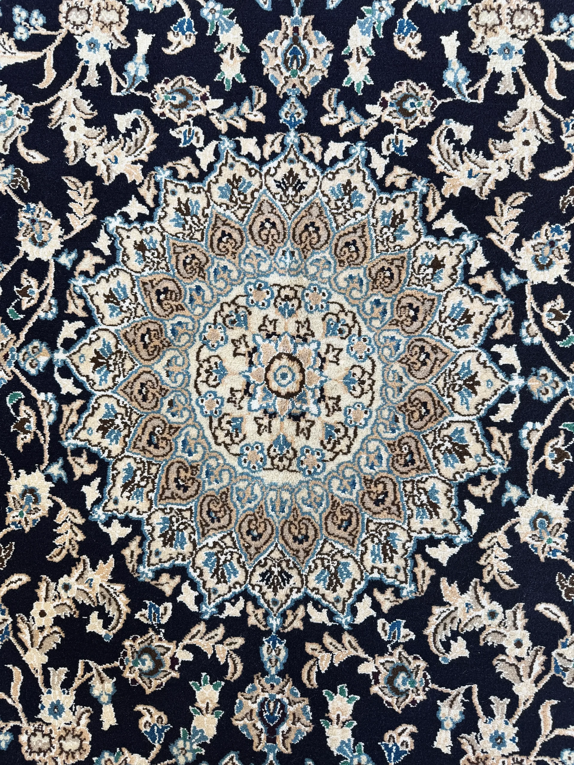 Il design è caratterizzato da motivi floreali intricati e geometrici disposti in modo simmetrico, con un centro circolare che cattura l’attenzione e dona armonia all’ambiente. Le tonalità di crema, blu, nero e beige si combinano per creare un contrasto equilibrato, rendendo questo tappeto persiano versatile e adatto sia a interni classici che moderni.
