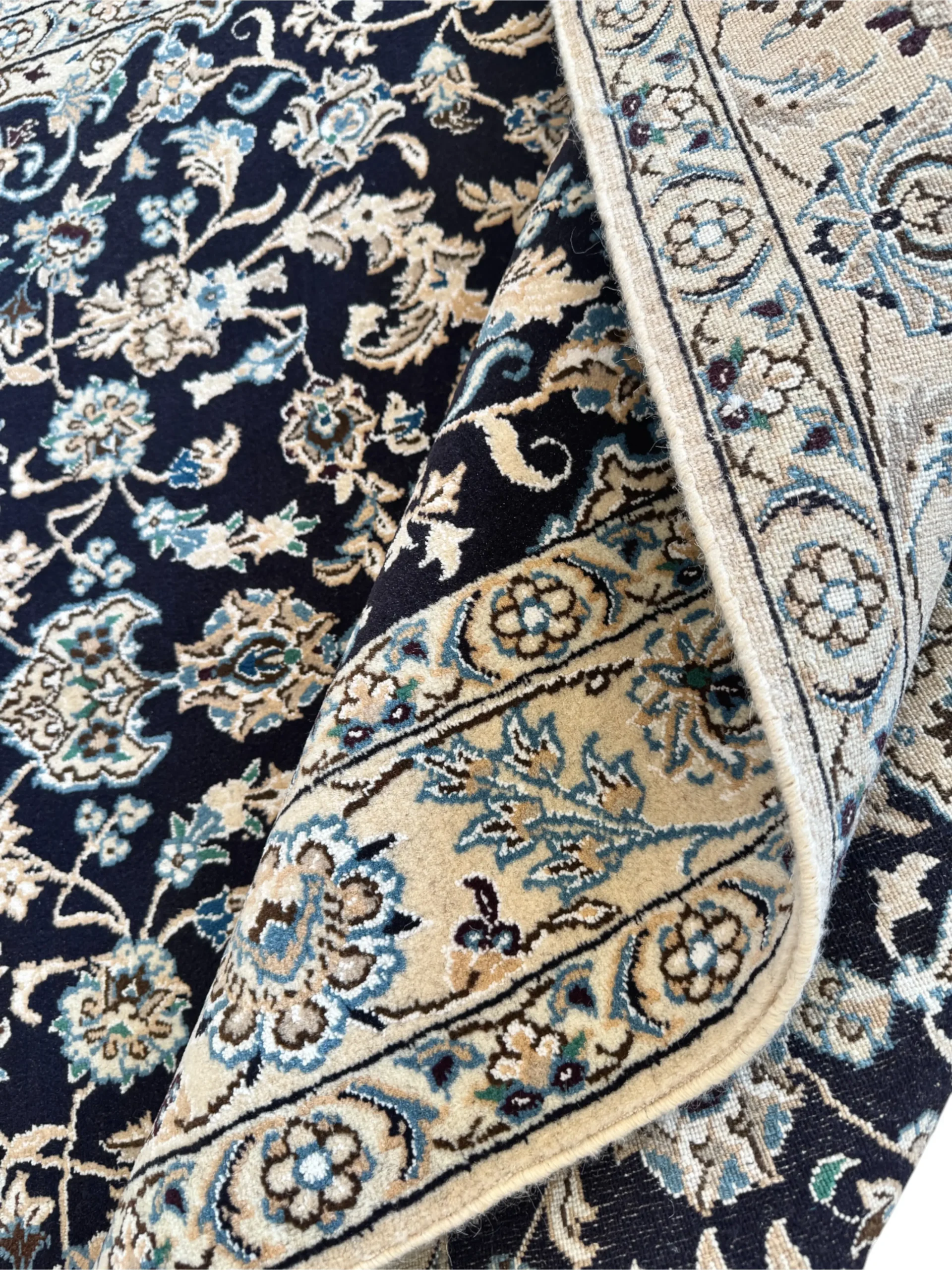 Ogni dettaglio, dai bordi finemente decorati alle frange in crema, testimonia l’abilità degli artigiani che hanno realizzato questo pezzo unico. I tappeti Nain 9 Fili sono tra i più pregiati al mondo, noti per la loro densità di nodi, durata e valore nel tempo.