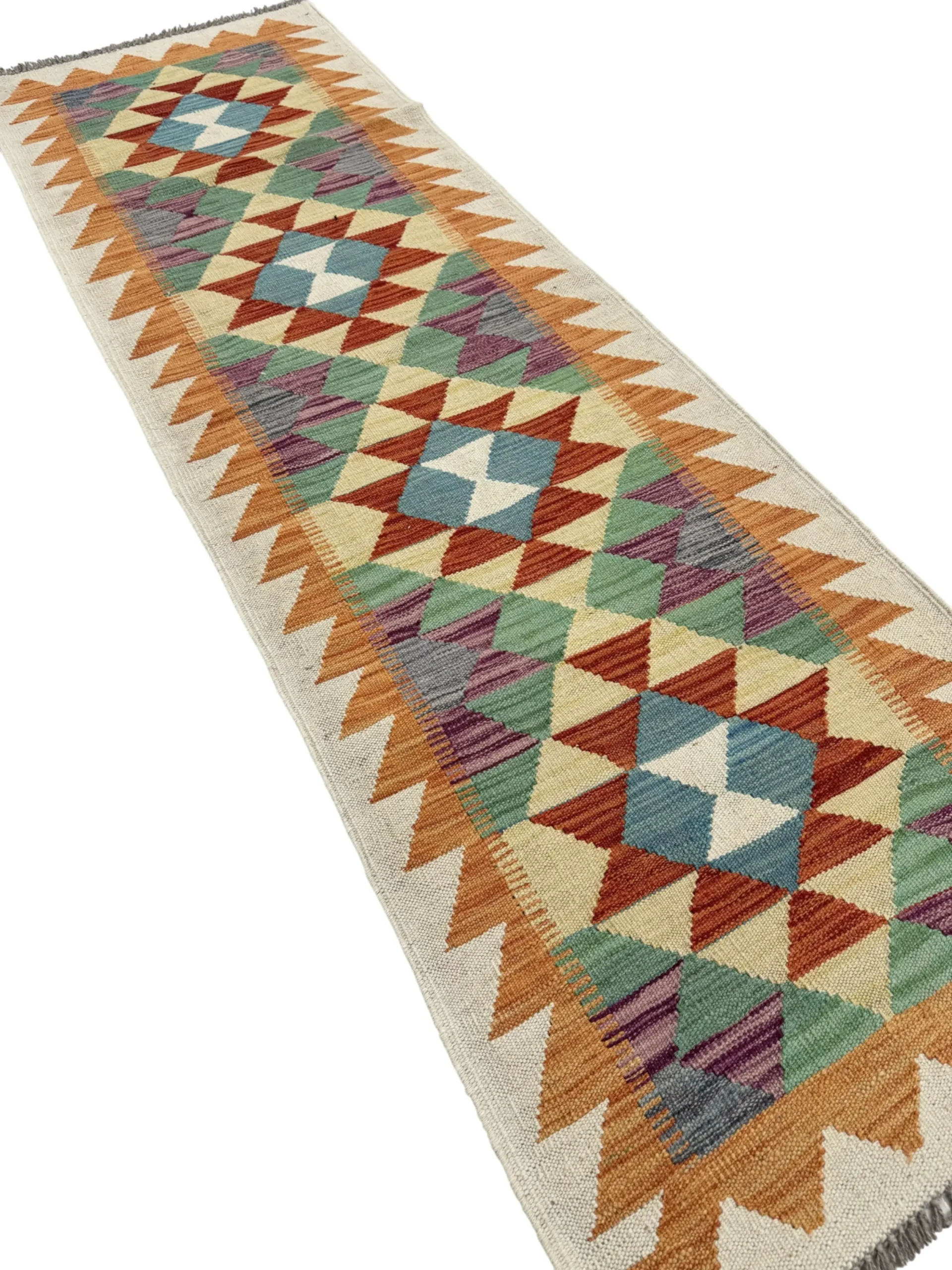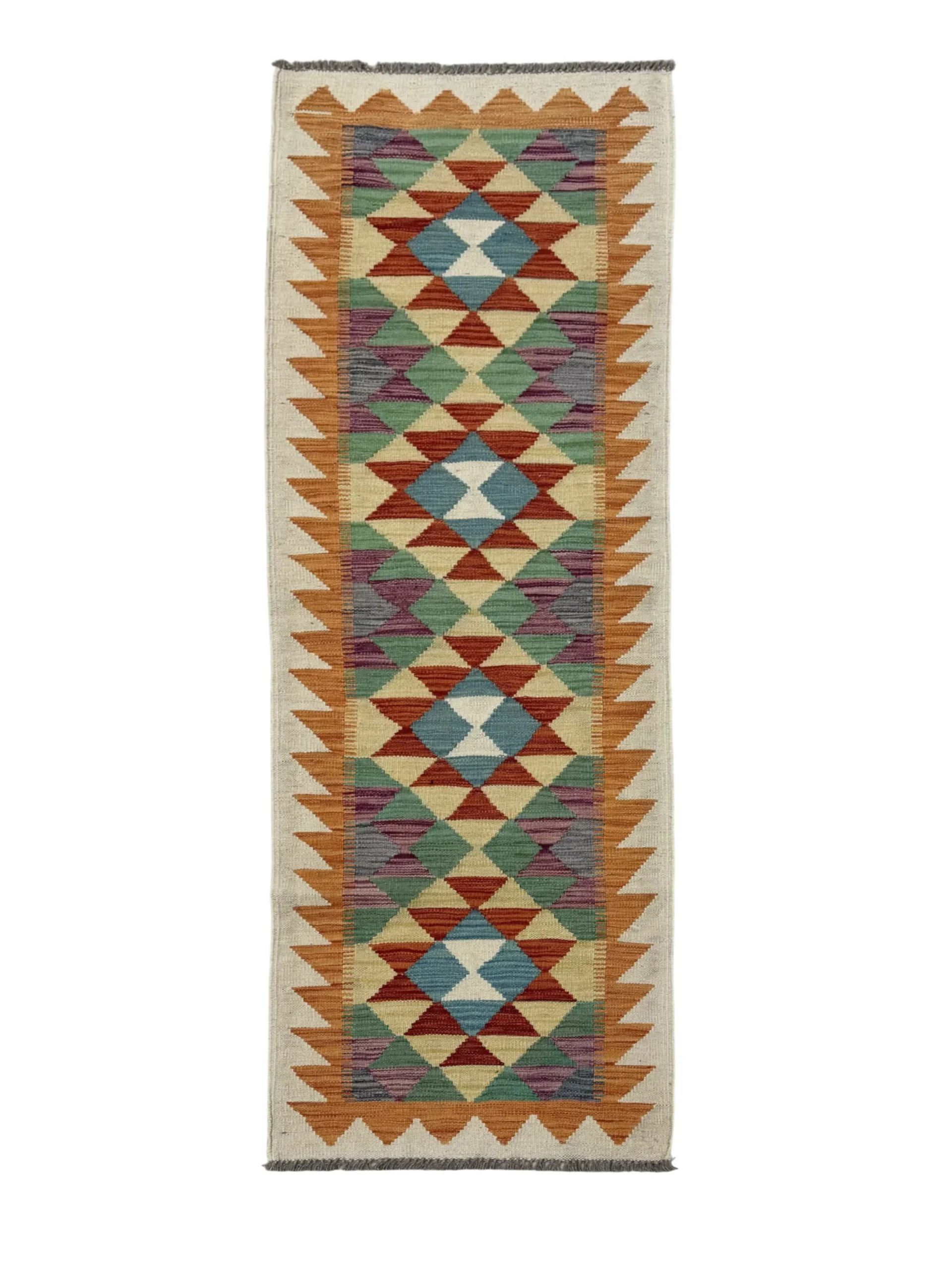 Tappeto Passatoia Geometrico Runner 180×65 cm in Lana – Fatto a Mano con Motivo a Losanghe Multicolore