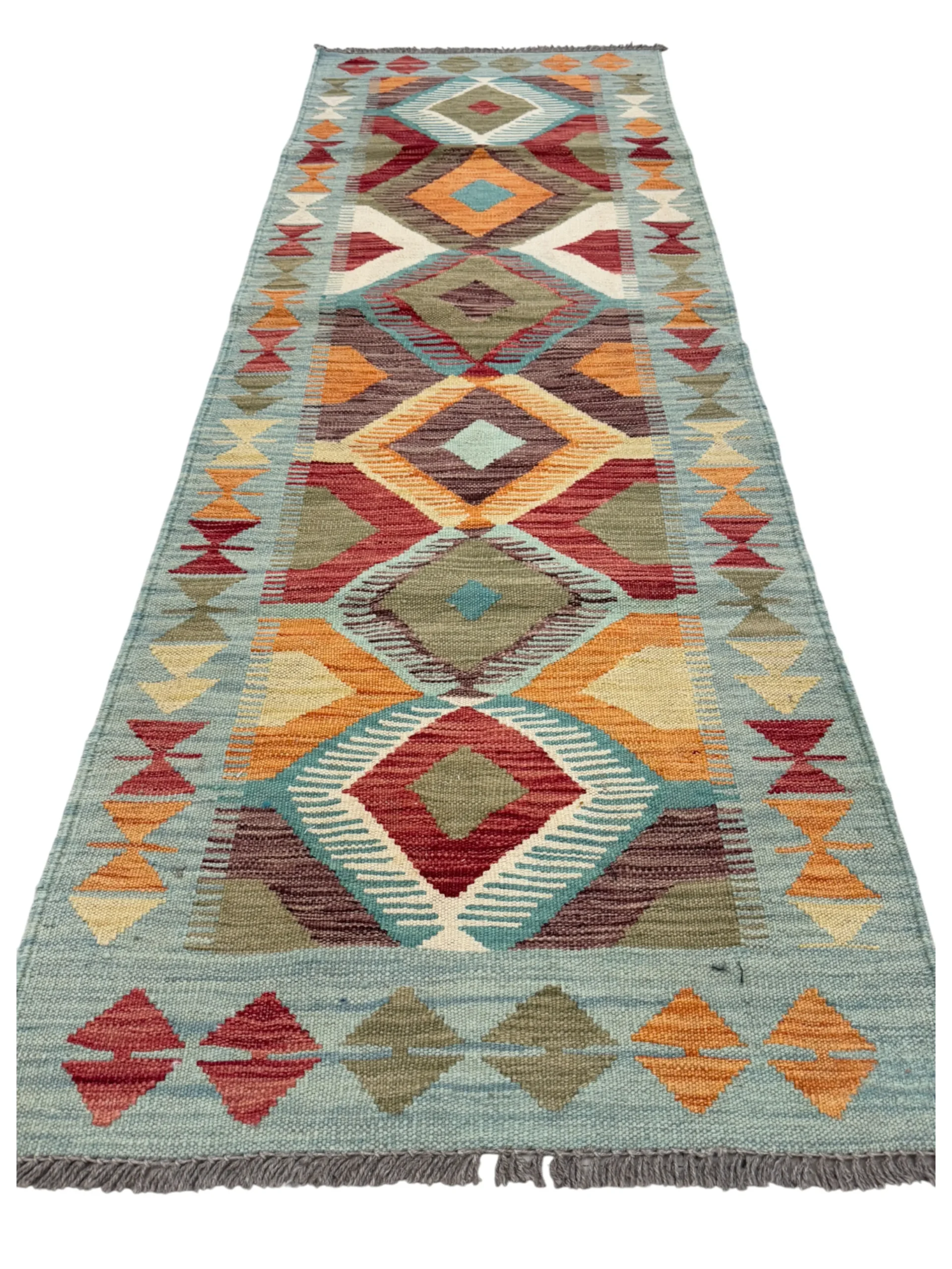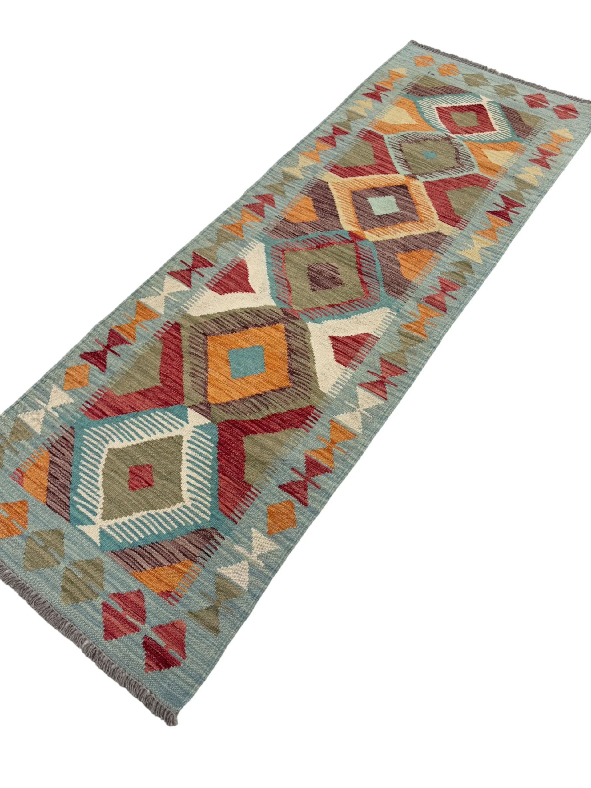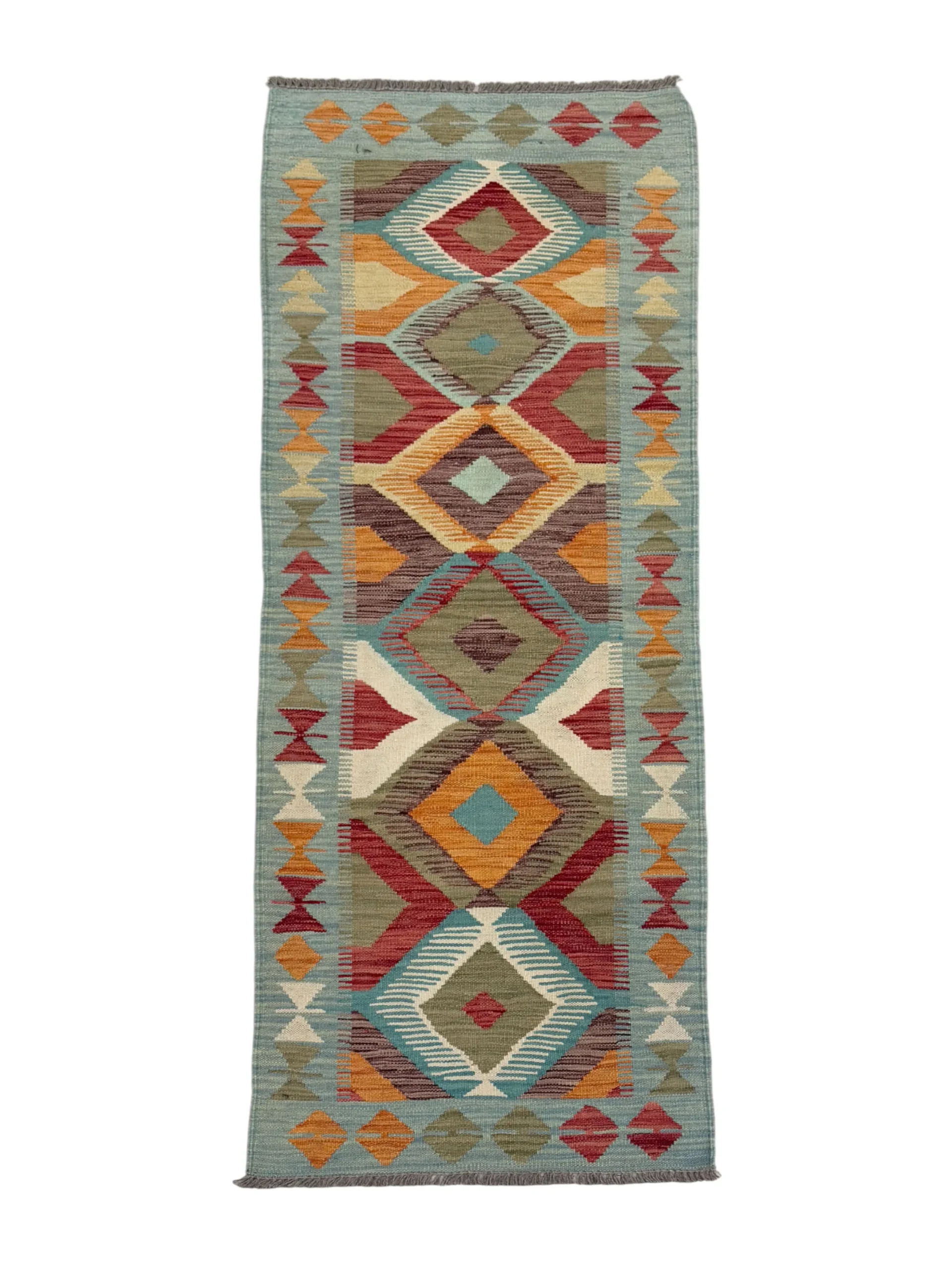 Elegante tappeto passatoia geometrico 188×64 cm, realizzato a mano in lana pregiata con un vivace motivo a rombi multicolore su bordo turchese. Ideale per corridoio, cucina o ingresso, unisce stile orientale, artigianalità e resistenza, aggiungendo calore e personalità a ogni ambiente.