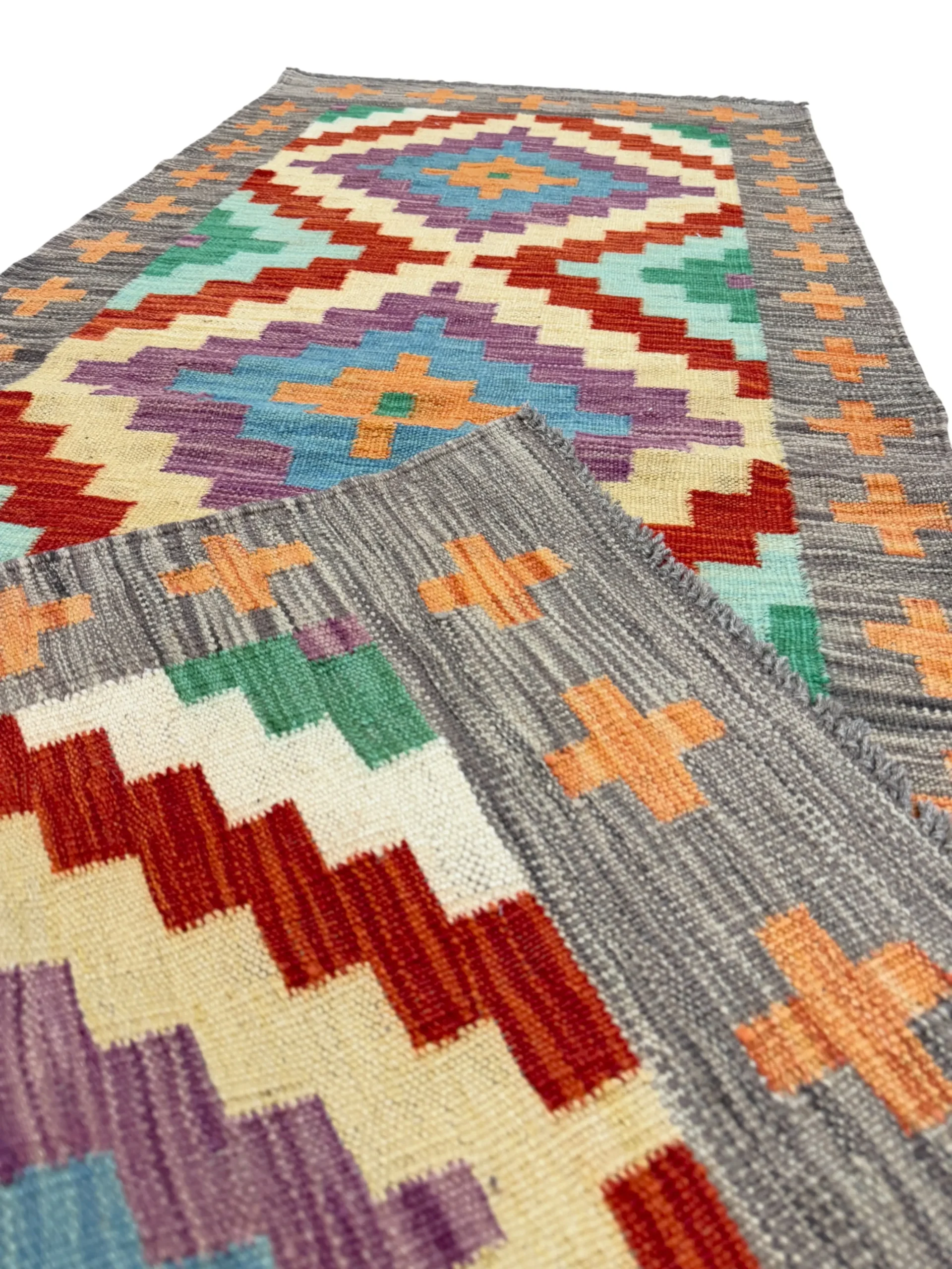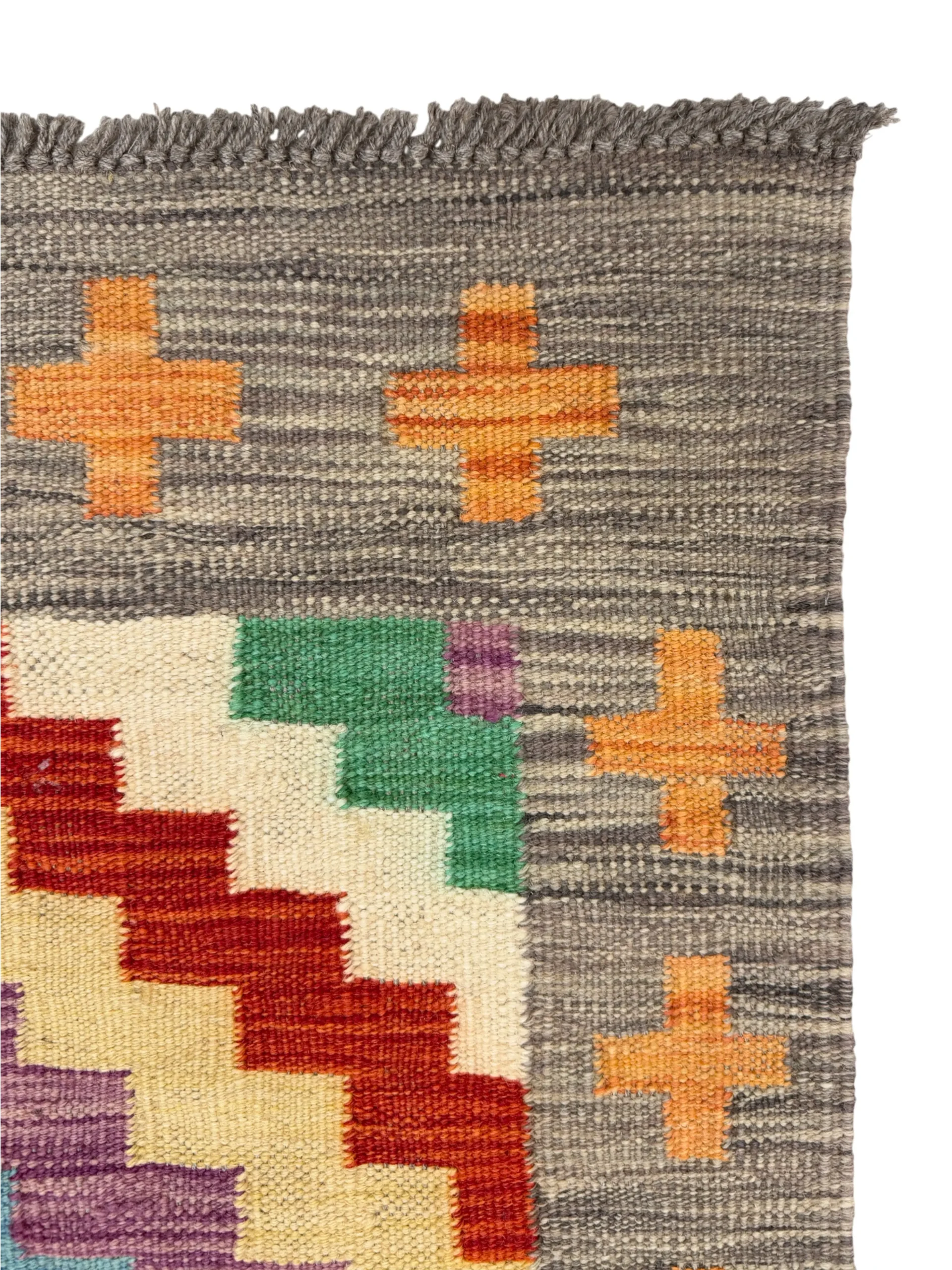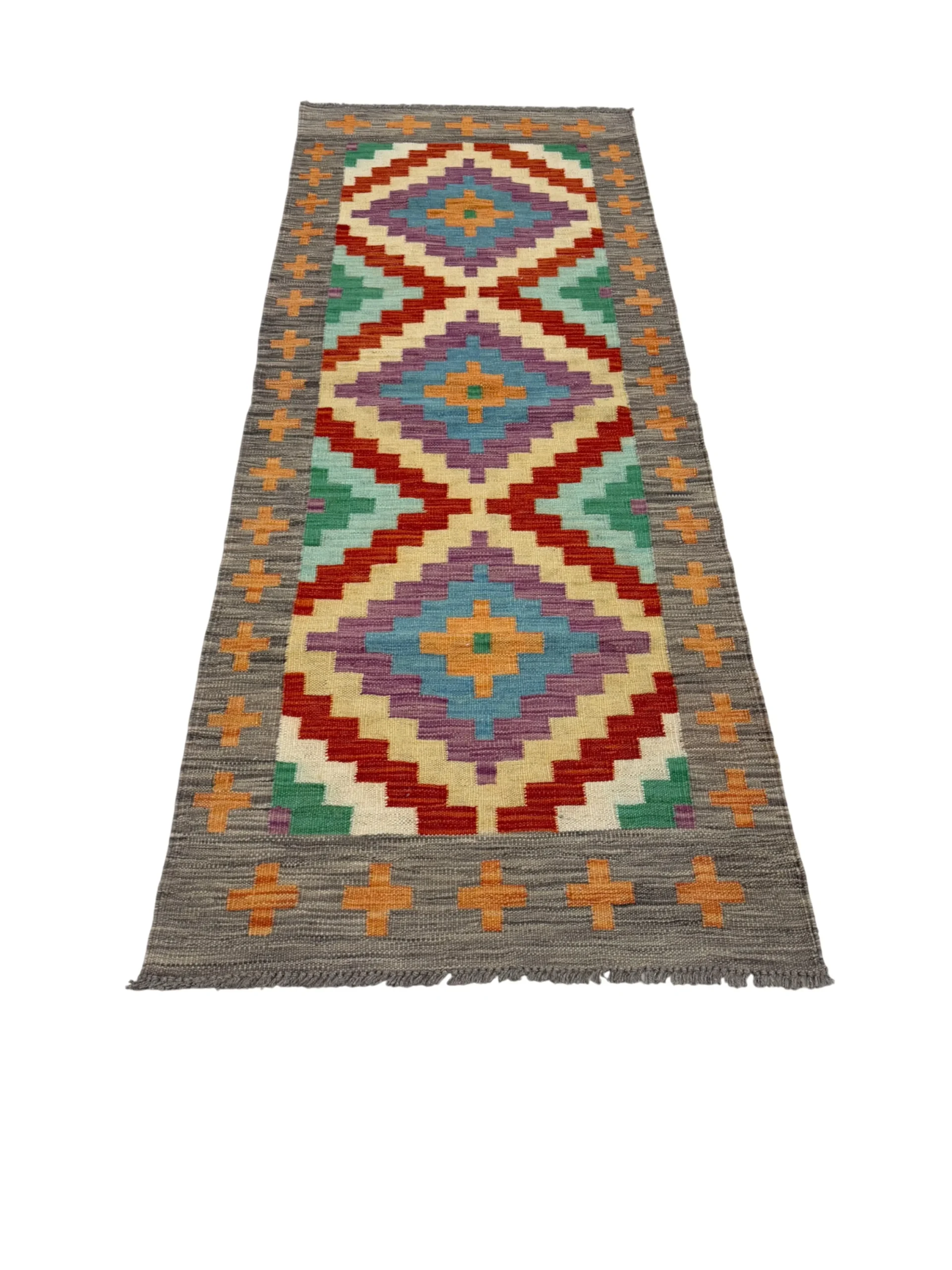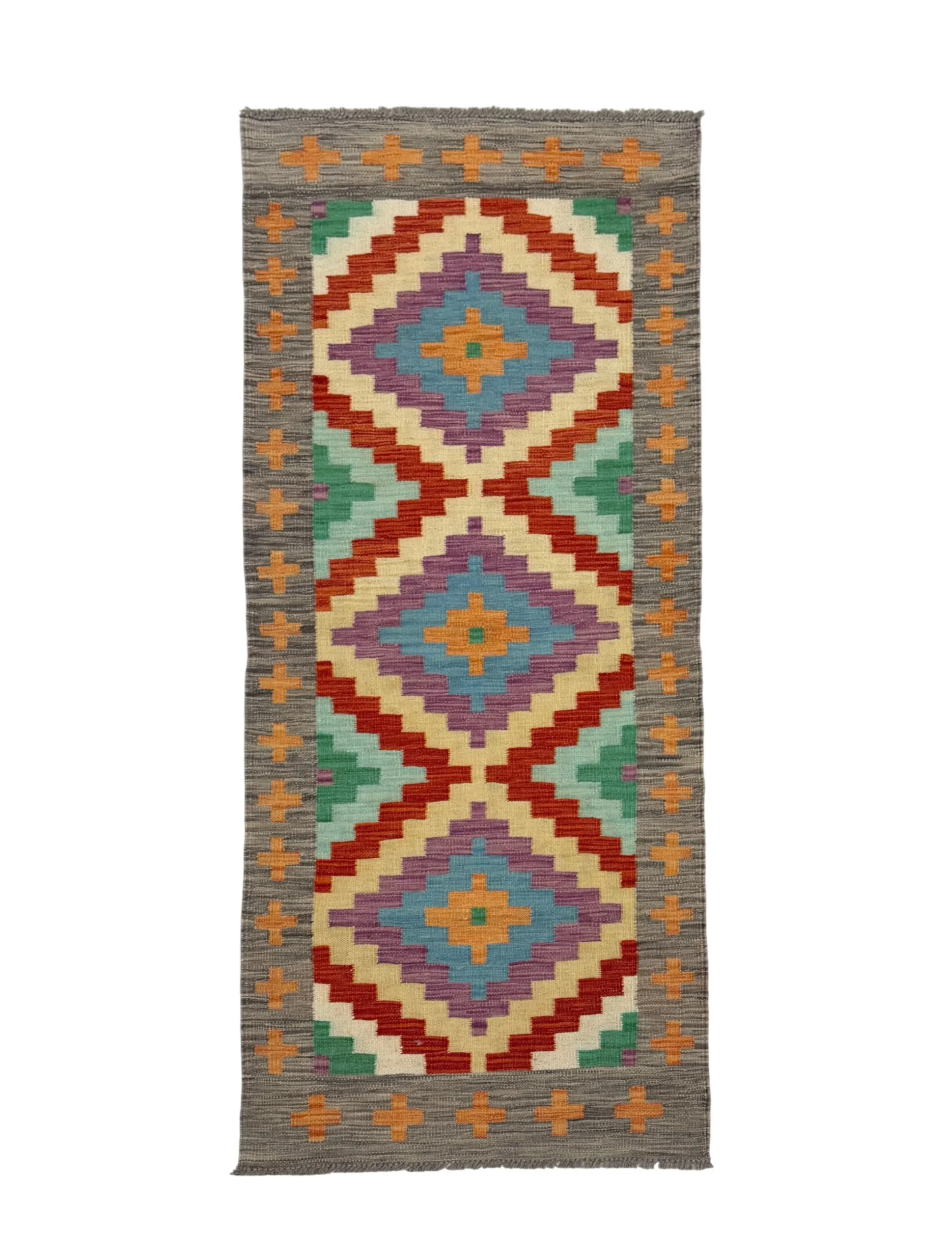 Scopri il nostro esclusivo tappeto passatoia rettangolare 192 × 76 cm, pensato per trasformare ogni ambiente con un tocco di colore e stile. Il motivo geometrico centrale, costituito da losanghe ripetute nelle tonalità rosso, viola, turchese, giallo e verde — ciascuna impreziosita da un piccolo quadrato arancione al centro — crea un effetto visivo dinamico e coinvolgente. Il bordo grigio scuro, decorato con piccoli simboli arancioni a forma di croce, incornicia il tappeto con eleganza e sottolinea la qualità artigianale del design.