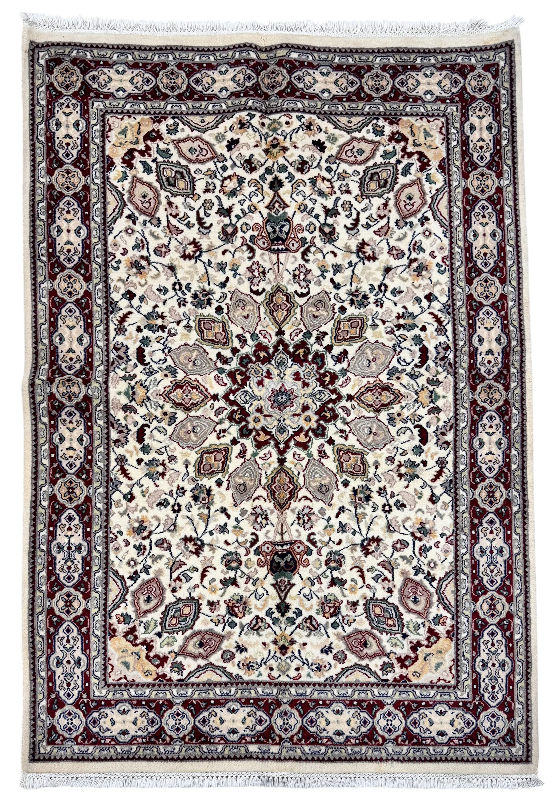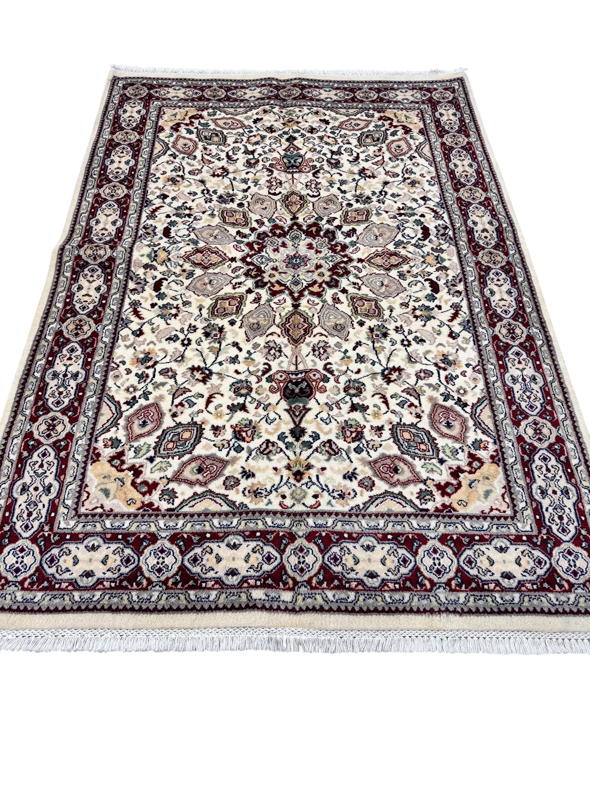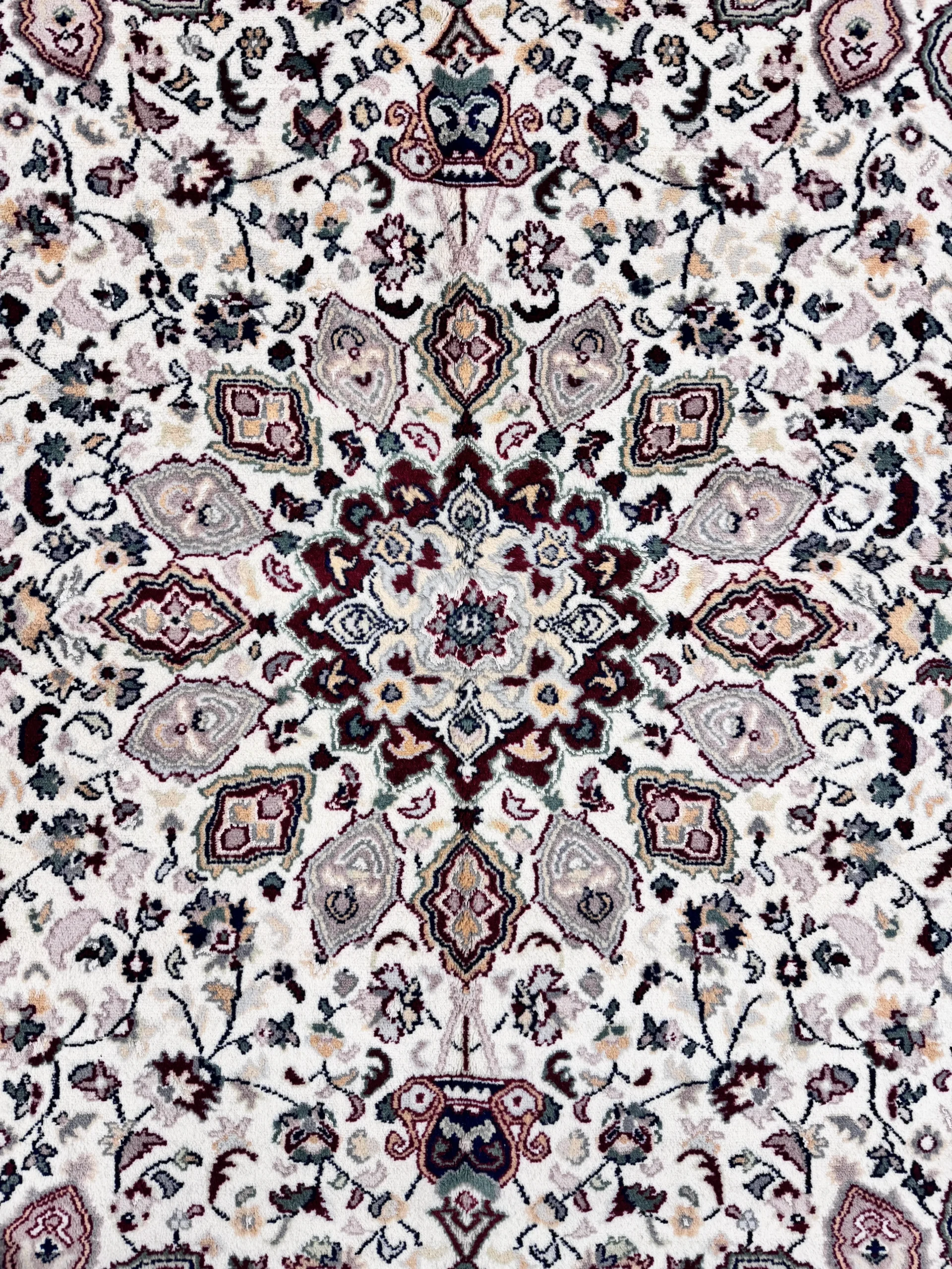 Tappeto persiano Islamabad in misura 199×138 cm, una scelta raffinata per chi cerca tappeti persiani autentici dal gusto classico, capaci di valorizzare subito l’ambiente. Il disegno con medaglione centrale e ricchi motivi floreali crea un punto focale elegante, mentre la cornice bordeaux dona profondità e carattere: perfetto per arredare con stile senza appesantire.